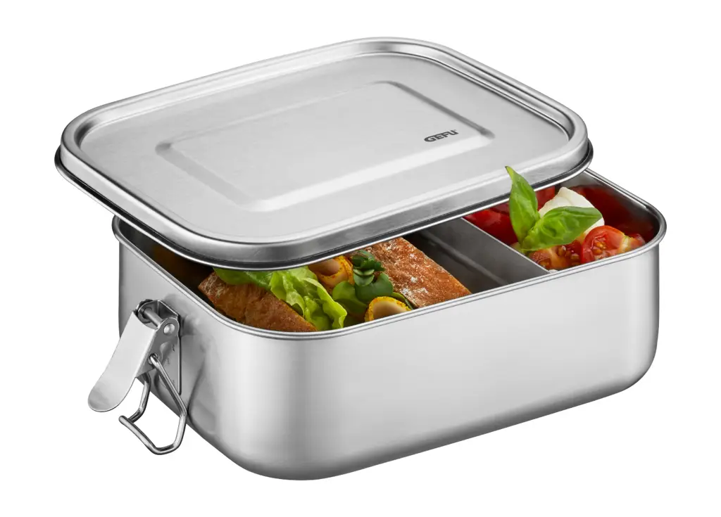 Prezentowany lunchbox o pojemności 1 L wykonany został ze stali nierdzewnej i silikonu (uszczelka w pokrywie), dzięki czemu jest wytrzymały, odporny na korozję i przy tym 100% szczelny. Jego design w stylu retro sprawia, że pojemnik wspaniale zaprezentuje się w szkole lub biurze, będąc też przydatnym w podróży. Wewnątrz lunchbox posiada ruchomą przegrodę, która pozwala na przenoszenie dwóch różnych potraw jednocześnie. Produkt dzięki możliwości wielokrotnego używania będzie ekologiczną alternatywą dla mniej trwałych lub jednorazowych opcji doskonale nadając się do kanapek, przekąsek, sałatek i wielu innych posiłków. Zachowa przy tym ich świeżość i gotowość do spożycia. Dodatkową zaletą będzie możliwość mycia lunchboxu w zmywarce.