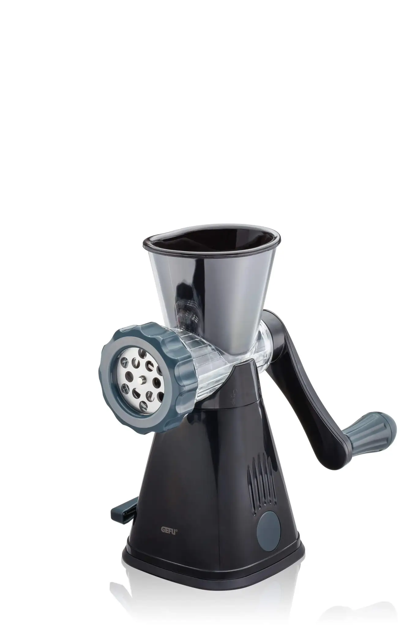 Maszynka do mięsa METTO oferuje bogate wyposażenie: nasadkę do kruchych ciastek z trzema wzorami, lejek do kiełbas oraz samoostrzący nóż skrzydełkowy. Bezpieczny popychacz i antypoślizgowa podstawa z przyssawką zapewniają komfort i stabilność użytkowania.
