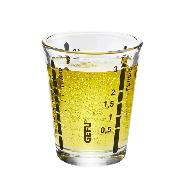 Prezentowana miarka kuchenna MESSI w formie kubeczka o pojemności 40 ml to niezastąpiony pomocnik w kuchni, doskonale nadając się zarówno do płynów jak woda czy oliwa, jak i do przypraw. Wykonana została z przezroczystego szkła, dzięki czemu umieszczone w niej płyny czy produkty sypkie są bardzo dobrze widoczne. Materiał ten nie wpływa także na smak oraz nie przejmuje zapachu. Miarka odporna jest na temperaturę do 95°C, co pozwala na umieszczanie w niej zarówno zimnych jak i ciepłych składników. Czytelna, oznaczona na czarno skala umożliwia łatwe odmierzenie nawet niewielkiej ilości w czterech jednostkach: łyżeczkach (TSP), łyżkach stołowych (TBSP), mililitrach (ml) oraz uncjach (fl. oz.). Dodatkową zaletą miarki jest łatwość w utrzymaniu jej w czystości - produkt przystosowany został zarówno do mycia ręcznego jak i z pomocą zmywarki.
