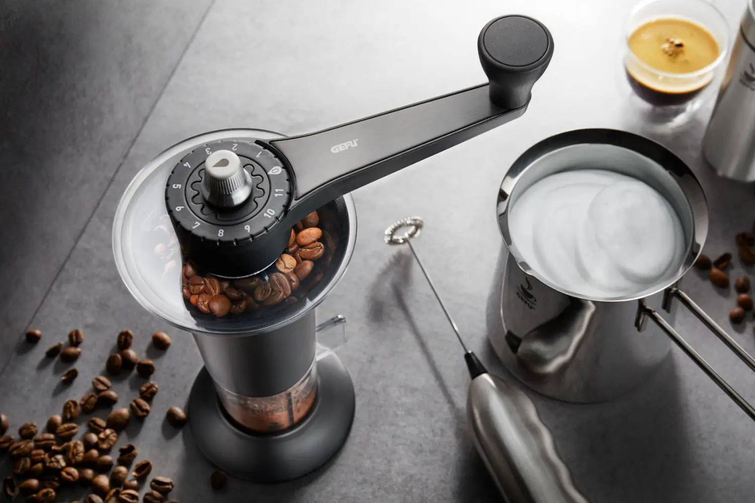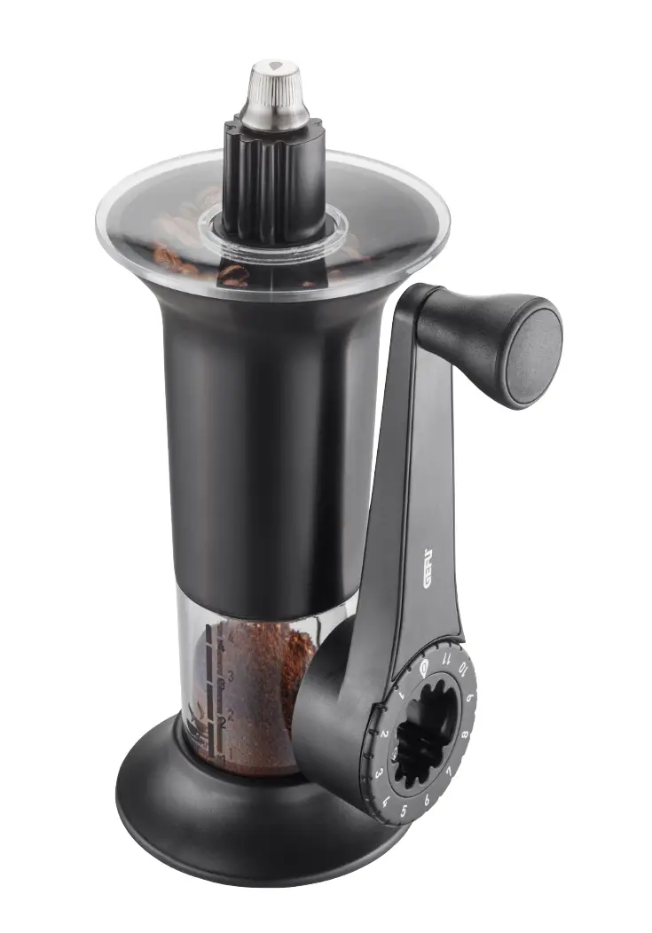 Prezentowany młynek ręczny do kawy LORENZO w kolorze czarnym wykonano z wysokiej jakości stali nierdzewnej, plastiku i ceramiki. Elegancki design sprawia, że estetycznie prezentuje się na blacie. Jest przy tym praktyczny - pozwoli on na przygotowanie idealnie zmielonej kawy, dzięki 11-stopniowej skali łatwo i precyzyjnie dostosowując się do potrzeb i preferencji. Jednorazowo można z jego pomocą uzyskać ilość kawy na 4 filiżanki - w odmierzaniu pomoże podziałka pojemnika. Odłączana, mocowana pionowo z boku pojemnika korba nie tylko zapewni wygodne mielenie, ale i ułatwi przechowywanie, oszczędzając miejsce.