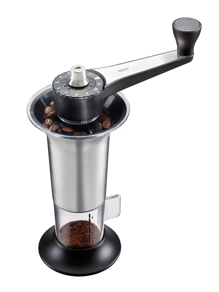 Prezentowany młynek ręczny do kawy LORENZO w kolorze srebrnym wykonano z wysokiej jakości stali nierdzewnej, plastiku i ceramiki. Elegancki design sprawia, że estetycznie prezentuje się na blacie. Jest przy tym praktyczny - pozwoli on na przygotowanie idealnie zmielonej kawy, dzięki 11-stopniowej skali łatwo i precyzyjnie dostosowując się do potrzeb i preferencji. Jednorazowo można z jego pomocą uzyskać ilość kawy na 4 filiżanki - w odmierzaniu pomoże podziałka pojemnika. Odłączana, mocowana pionowo z boku pojemnika korba nie tylko zapewni wygodne mielenie, ale i ułatwi przechowywanie, oszczędzając miejsce.