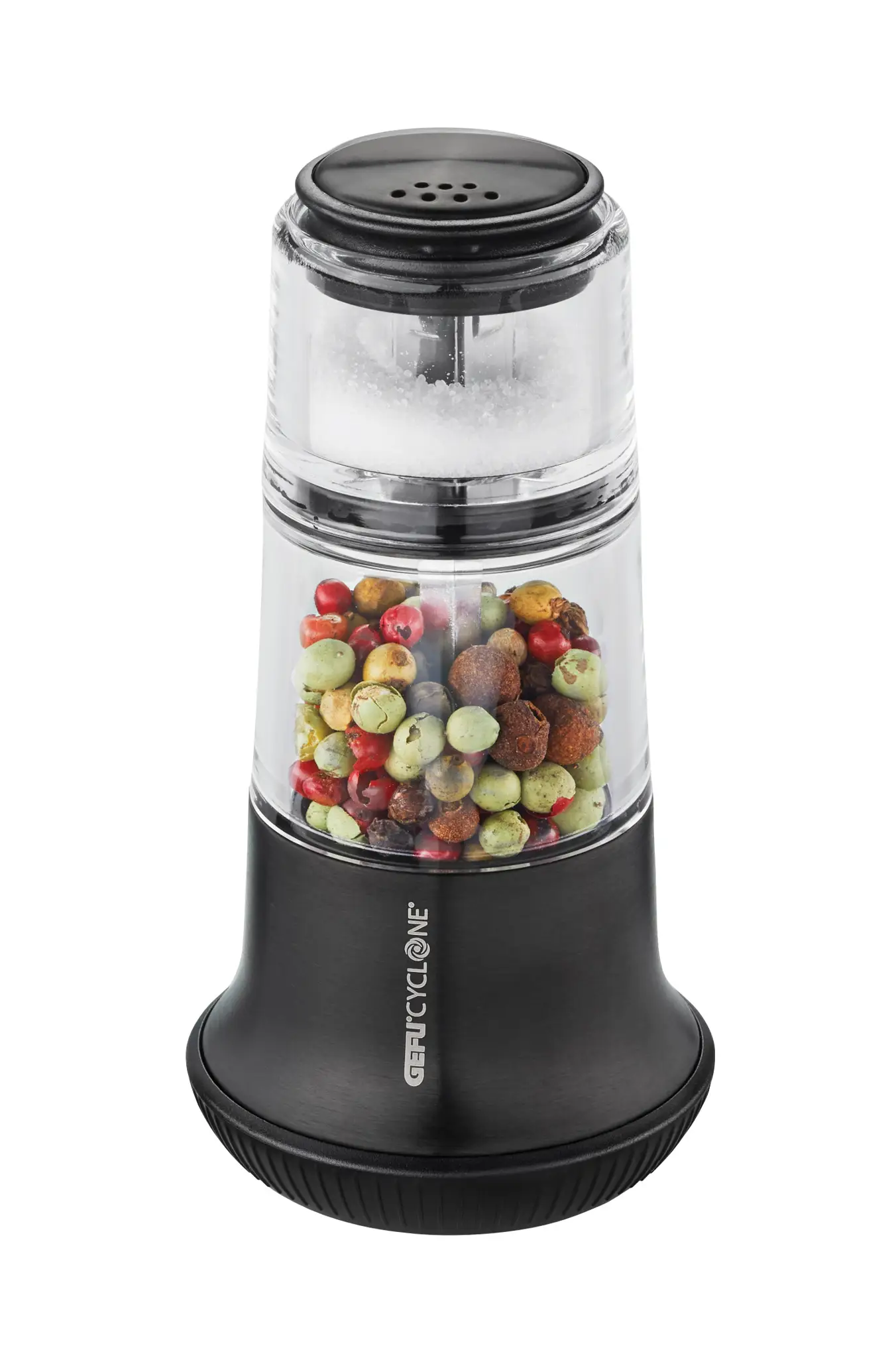 Prezentowany młynek 2w1 o wymiarach 5,5 x 10,8 cm (śr. x wys.) i czarnym kolorze będzie efektywnym rozwiązaniem dla tych którzy cenią sobie praktyczność połączoną z minimalizmem. Wyposażony został w ceramiczne ostrza CYCLONE, zapewniające najwyższą precyzję i wydajność mielenia, co pozwala na łatwe i szybkie wydobycie pełnego aromatu i eksperymentowanie z jego intensywnością. Dodatkowo oferują one możliwość regulacji mielenia - od bardzo drobnego proszku po grube fragmenty. Młynek posiada zintegrowaną solniczkę w górnej części, w której umieścić można drobną sól. Komory młynka są łatwe do napełniania, a ich przezroczyste ścianki ułatwiają kontrolę ilości zawartości. Produkt wykonany został z wysokiej jakości stali nierdzewnej, tworzywa sztucznego oraz aluminium i w razie potrzeby należy go czyścić wyłącznie ręcznie.