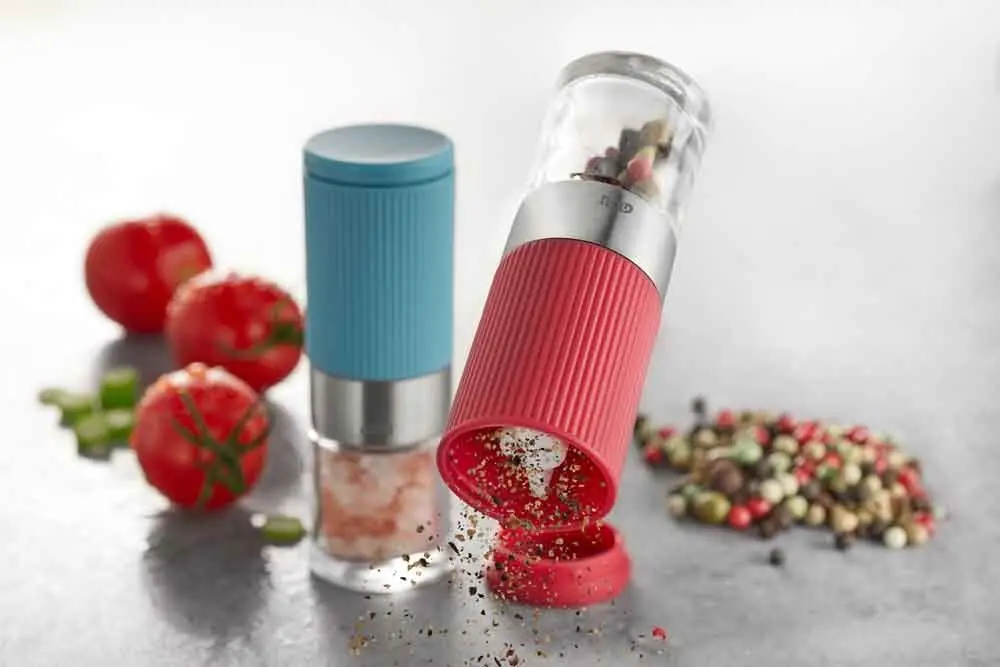 Zbudowany jest z części mielącej z zamykanym zasobnikiem na zmielona przyprawę oraz przezroczystego zasobnika na przyprawę przed zmieleniem. Młynek działa na zasadzie obrotu względem siebie części dolnej i górnej młynka.