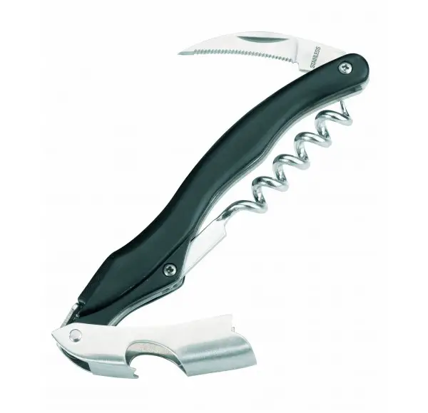 Niezwykle pomocny przyrząd do otwierania butelek z napojami znajdzie swoje zastosowanie w każdej kuchni, zarówno w domu jak i w restauracji. Przeznaczony jest do otwierania butelek kapslowanych i korkowanych. Posiada on trzy akcesoria w jednym, takie jak: korkociąg, otwieracz kapsli oraz ząbkowany nożyk do zdejmowania metalowej osłony korka.