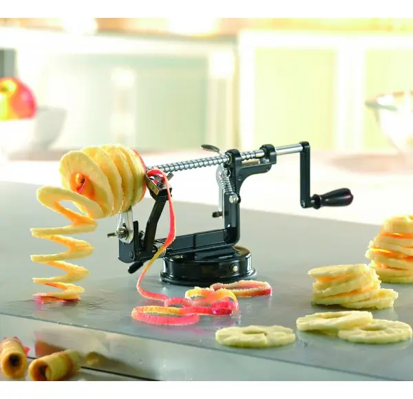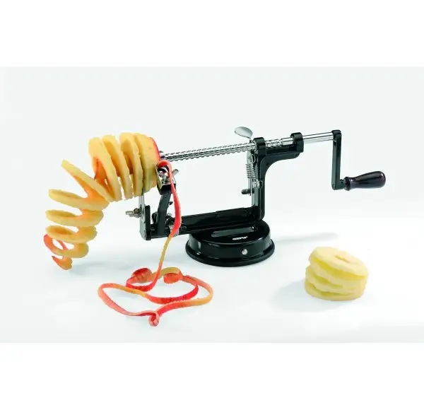 Spełnia ona trzy funkcje naraz; obiera ze skórki i jednocześnie kroi na spirale, z których możemy sporządzić wiele ciekawych i oryginalnych potraw, według naszej fantazji. Usuwa także gniazdka z pestkami. Przyrząd ten przeznaczony jest głównie do jabłek, poradzi sonie również z gruszkami i ziemniakami.