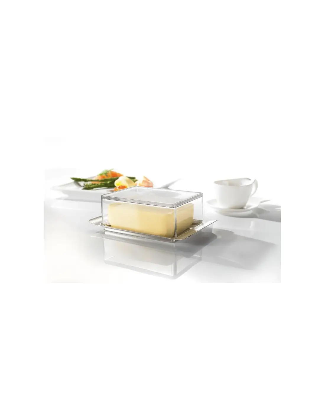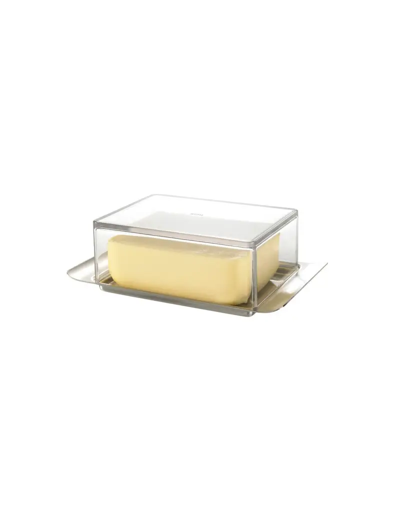 Stylowy pojemnik na masło świetnie prezentuje się na stole każdej nowoczesnej kuchni lub jadalni. Przeznaczony jest na 250 g masła. Składa się z tacki wykonanej ze stali nierdzewnej, wyposażonej w dwa wygodne uchwyty, oraz pokrywy z tworzywa sztucznego. Pasuje do półek na drzwiach w lodówce. Produkt nadaje się do mycia w zmywarce.