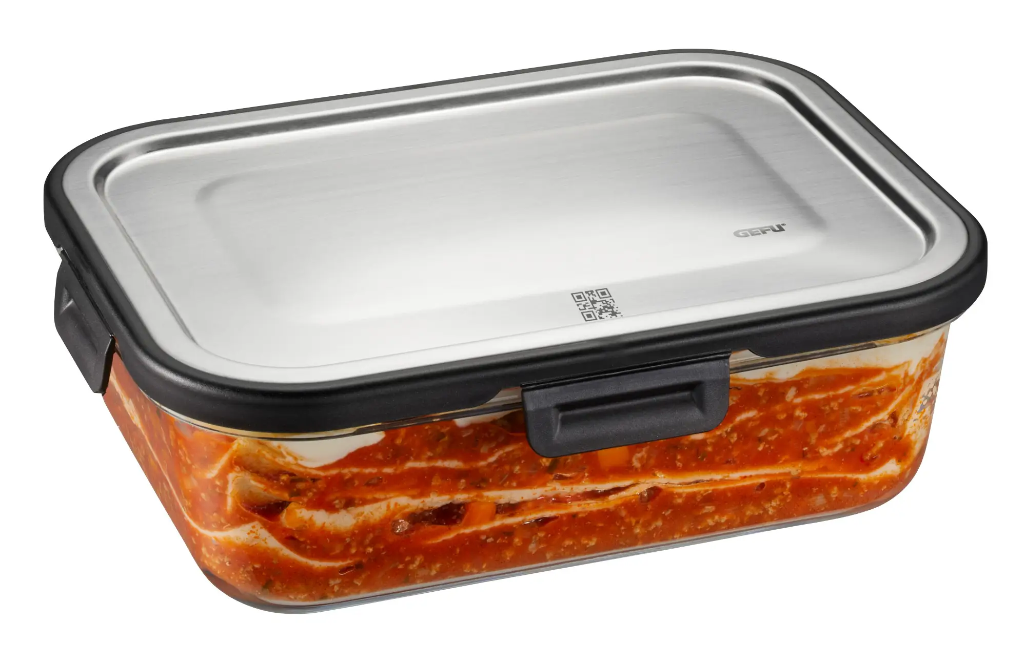 Prezentowany prostokątny pojemnik o wymiarach 23,2 x 17,6 x 7,5 cm (dł. x szer. x wys.) i pojemności 1500 ml wykonany został ze szkła borokrzemowego oraz stali nierdzewnej i tworzywa sztucznego (pokrywa). Pomimo zastosowania tych materiałów jest on wyjątkowo lekki. Pojemnik jest wygodny w otwieraniu i zamykaniu - pokrywa wyposażona została w cztery duże zatrzaski. Silikonowa uszczelka sprawia z kolei, że po zamknięciu jest on szczelny, co zapobiega wyciekaniu płynów oraz zapewnia świeżość żywności na dłużej. Pojemnik odporny jest na szeroki zakres temperatur (od -20°C do 300°C) - wyższe temperatury nie dotyczą pokrywy - dzięki czemu można go używać np. do szybkiego podgrzania posiłku w piekarniku i mikrofali bez konieczności korzystania z dodatkowego naczynia. Zaletą produktu jest również łatwość czyszczenia - nie przejmuje zapachu i nie wpływa na smak, ponadto można go myć zarówno ręcznie jak i w zmywarce.