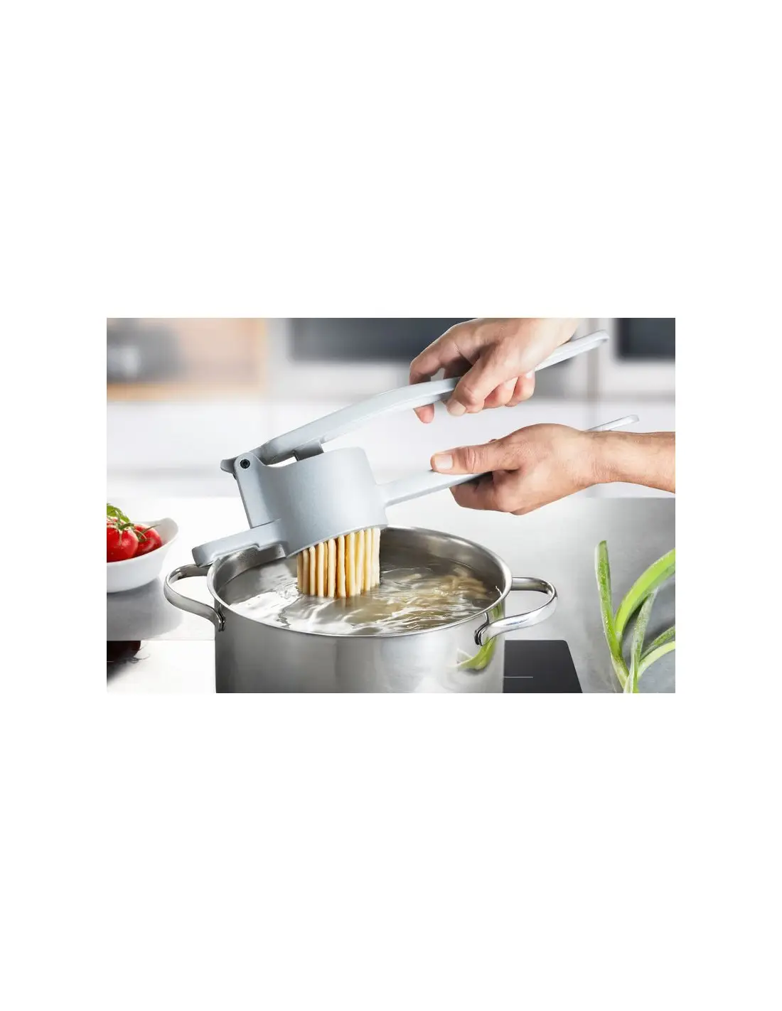 Praska do ziemniaków SPAETZLEBOUB wykonana została z wysokiej jakości stali nierdzewnej pokrytej dodatkowo aluminium. Wyprodukowała ją niemiecka firma GEFU. Przy użyciu tej praski bez wysiłku zrobisz puree ziemniaczane, musy owocowe, a nawet uformujesz makaron. Ergonomiczna rączka znacząco ułatwia pracę. Produkt jest łatwy w czyszczeniu, można go myć w zmywarce. Posiada 5-letnią gwarancję.