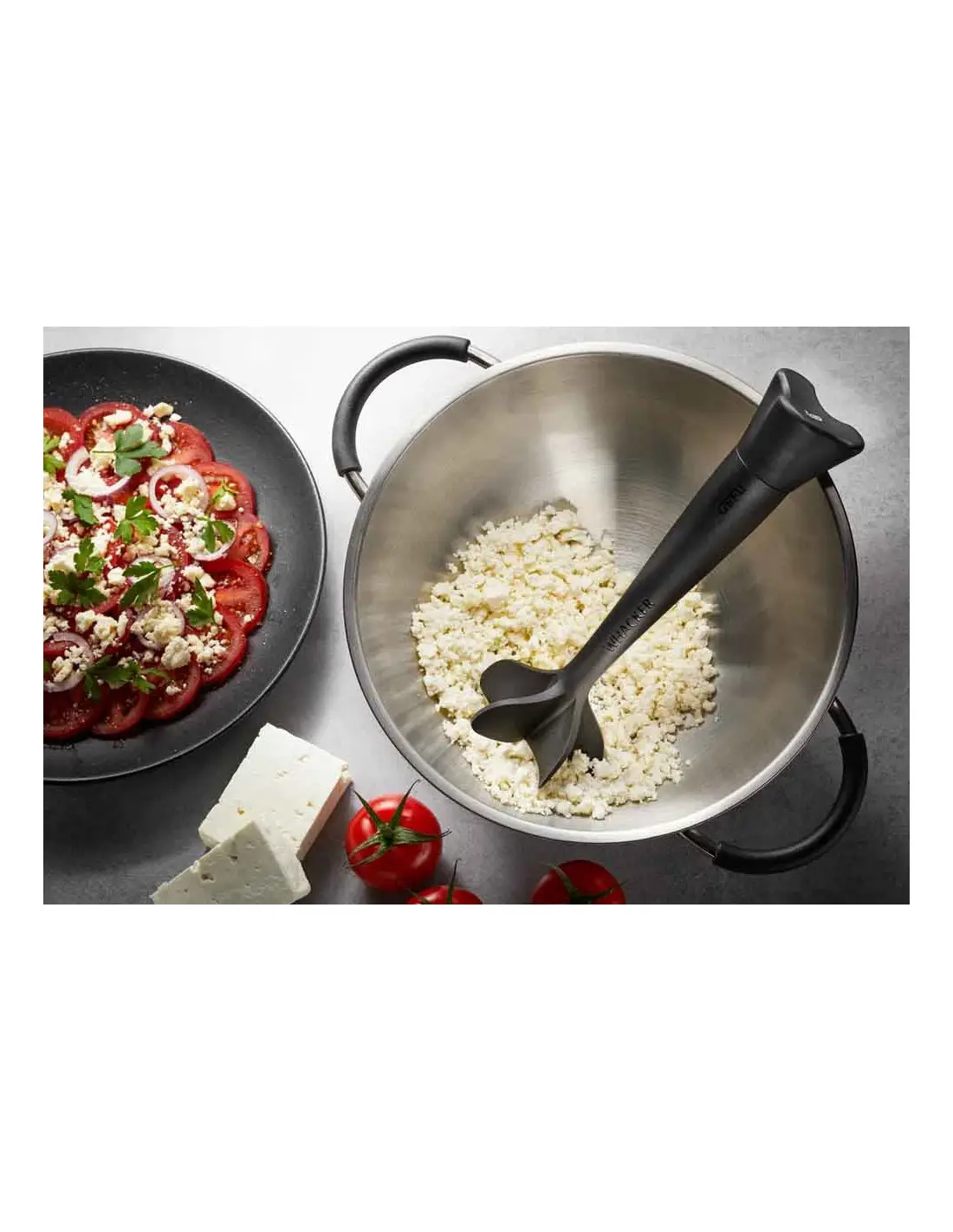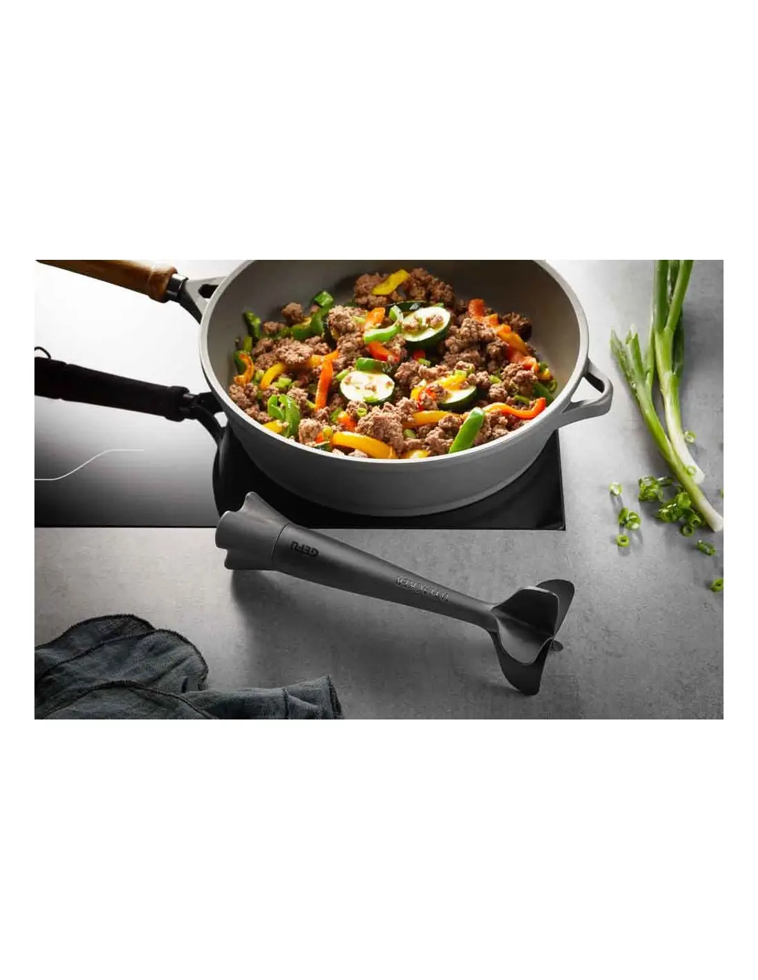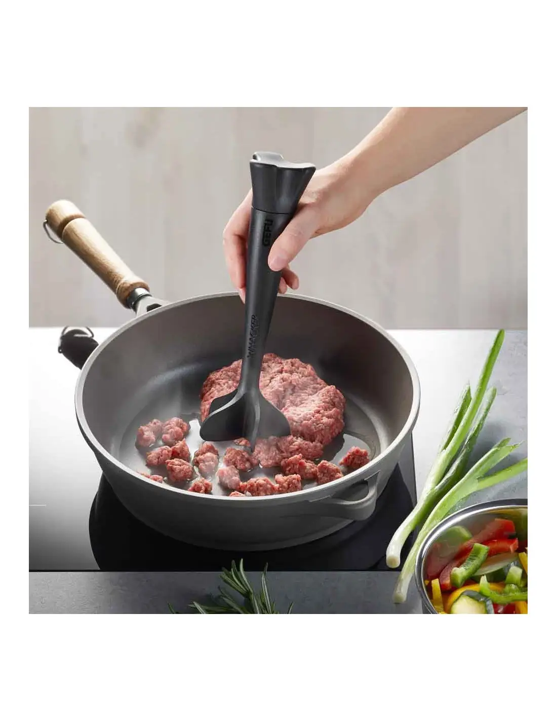Siekacz ręczny marki GEFU jest bardzo wygodny w użyciu, posiada długą, ergonomiczną rączkę, dzięki której idealnie leży w ręku. Z jego pomocą posiekasz mięso równomiernie, bez większego użycia siły, co wpłynie na wyniki smażenia. Siekacz znajdzie swoje zastosowanie przy częściowo zamrożonym mięsie mielonym, rozbijaniu tofu, ziemniaków i innych produktów spożywczych. Wykonany jest z nylonu odpornego na temperaturę do 210 stopni. Można go myć w zmywarce.