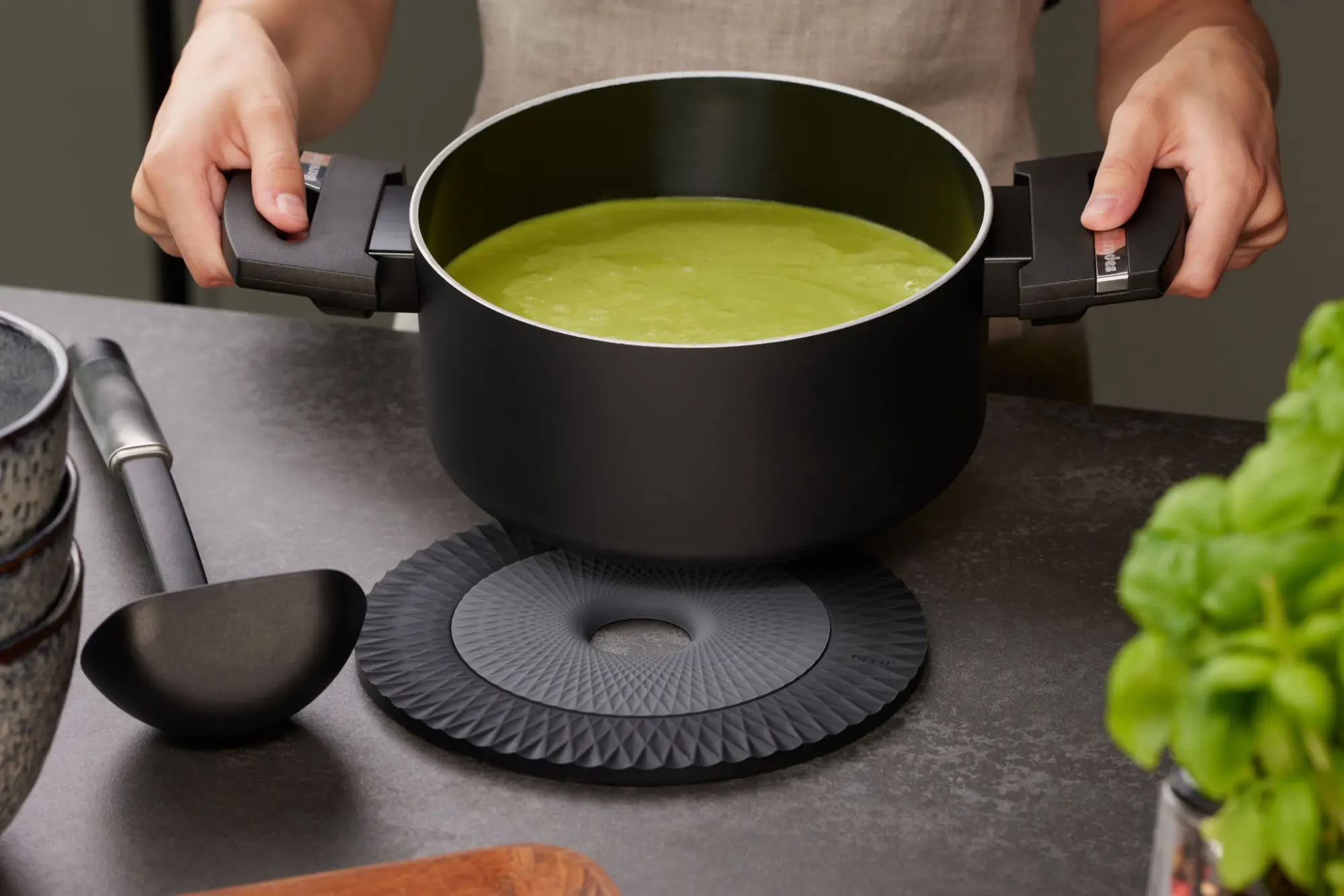 Prezentowana podstawka 2w1 CIRCO wykonana została z odpornego na temperaturę do 230°C silikonu o specjalnej strukturze plastra miodu, która nie tylko izoluje ciepło ale i jest antypoślizgowa, co zapewnia bezpieczeństwo i stabilność podczas używania. Produkt doskonale nada się pod gorące naczynia, skutecznie chroniąc powierzchnię blatu lub stołu przed uszkodzeniami, sprawdzając się np. do garnków, misek czy patelni. Nie będzie przy tym problemowy w przechowywaniu - możliwość trzymania podstawek razem oszczędzi miejsce i pomoże utrzymać porządek w szufladzie. Dodatkową zaletą podstawki jest łatwość w czyszczeniu - nadaje się ona do mycia w zmywarce.