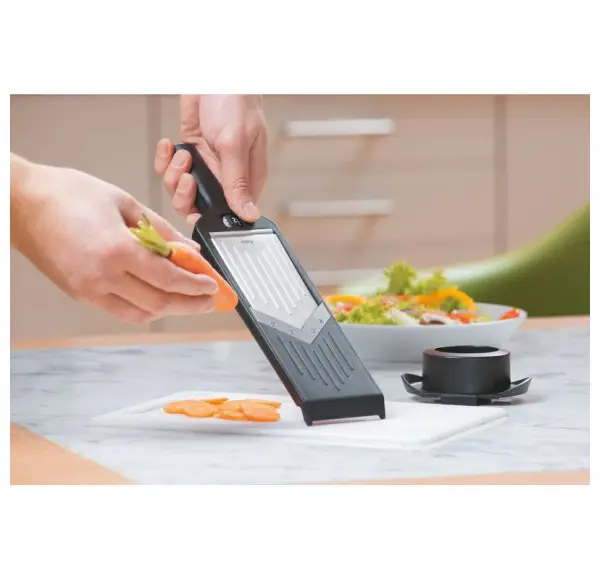Wykonana została z wysokiej jakości tworzywa sztucznego, posiada ostrze i ruchomą płytkę ze stali nierdzewnej. Przeznaczona jest do krojenia warzyw w plastry różnej grubości; posiada regulację grubości od 1 do 5 mm. W skład zestawu wchodzi dwuczęściowy uchwyt do prowadzenia krojonego warzywa. Zapewnia to bezpieczeństwo i komfort użytkowania. Produkt nadaje się do mycia w zmywarce.