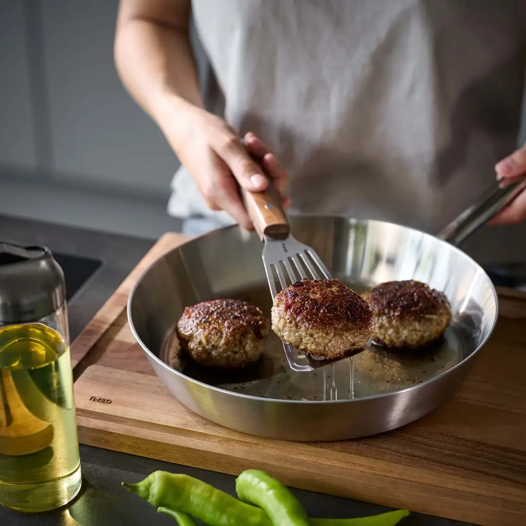 Solidna, nitowana rękojeść wykonana z drewna orzechowego zapewnia komfortowy chwyt i stabilność podczas użytkowania, a jej naturalna estetyka dodaje kuchni wyjątkowego charakteru. Perforowana konstrukcja pozwala na szybkie odcedzanie tłuszczu i płynów, co sprawia, że szpatułka jest niezwykle praktyczna w codziennym gotowaniu.