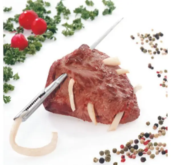 Szydło przeznaczone jest do faszerowania każdego rodzaju mięsa. Jego ostrze dobrze się wbija, a szczypce na drugim końcu umożliwiają przeciągnięcie przez otwór warzywa lub zioła, którym zamierzamy potrawę nafaszerować. Przyrząd wykonany został z najwyższej jakości stali nierdzewnej. Nadaje się do mycia w zmywarce.