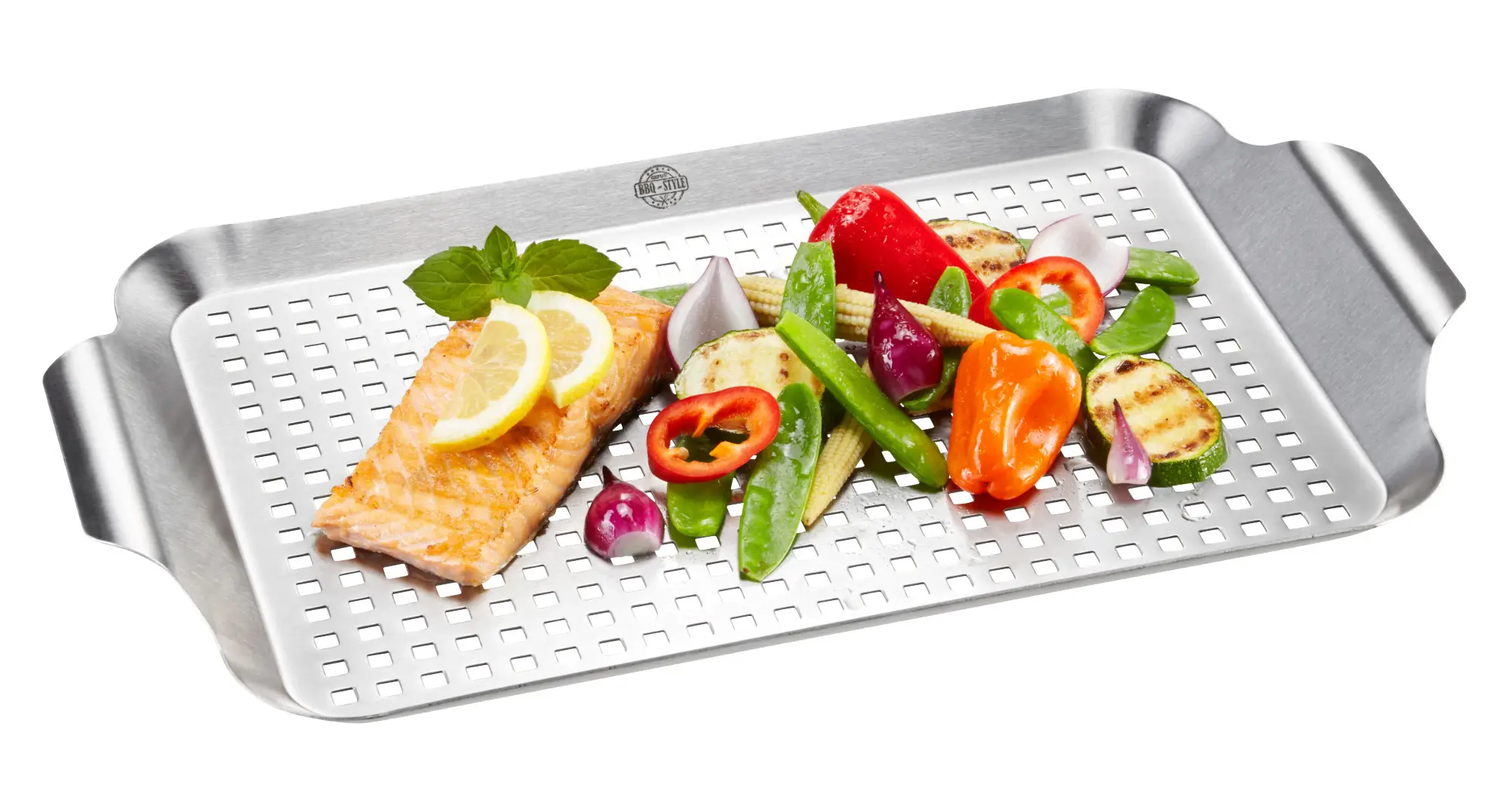 Prezentowana płaska taca grillowa w rozmiarze L (wymiary: 42,5 x 25,4 x 2,9 cm) wykonana została w całości z odpornej na korozję stali nierdzewnej. Będzie ona doskonałą alternatywą dla jednorazowych, szkodzących środowisku aluminiowych tacek, pozwalając na bezproblemowe przygotowanie delikatnych ryb, kawałków różnych warzyw i innych trudnych do ułożenia na kratce grillowej produktów. Perforowana powierzchnia zapewnia idealną cyrkulację powietrza, gwarantując równomierne i zdrowe gotowanie, a dwa wygodne uchwyty ułatwiają przenoszenie. Dodatkową zaletą tacki jest łatwość w utrzymaniu jej w czystości - można ją myć zarówno ręcznie jak i pomocą zmywarki.