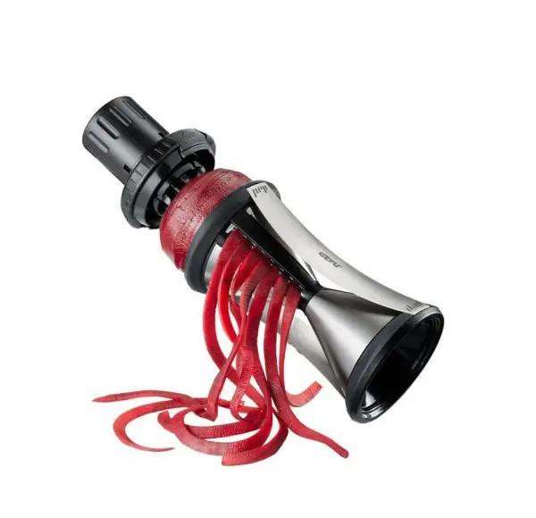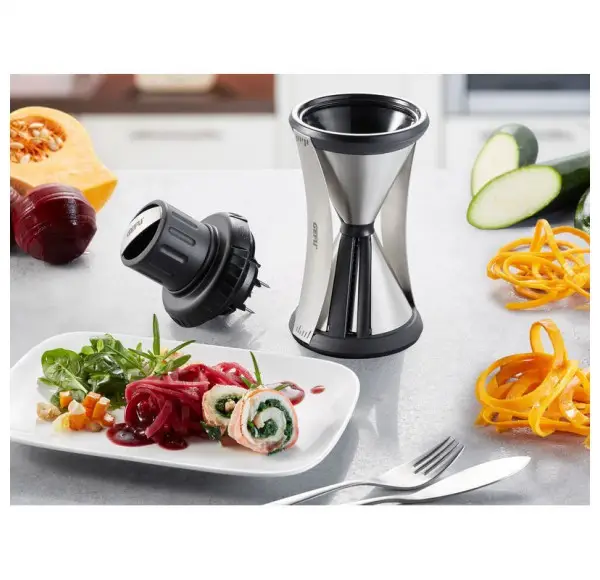 Wykonana została z najwyższej jakości stali nierdzewnej oraz z tworzywa sztucznego. Posiada wyjmowane pokrętło, do którego mocowane jest warzywo, za pomocą szpilek. Produkt nadaje się do mycia w zmywarce. Tarka Przeznaczona jest do tworzenia długich i cienkich pasków z warzyw. Mają swoje zastosowanie przy dekorowaniu potraw. Doskonale radzi sobie z warzywami takich jak: marchewka, rzodkiewka, burak, ogórek i wiele innych. Produkt nadaje się do mycia w zmywarce.
