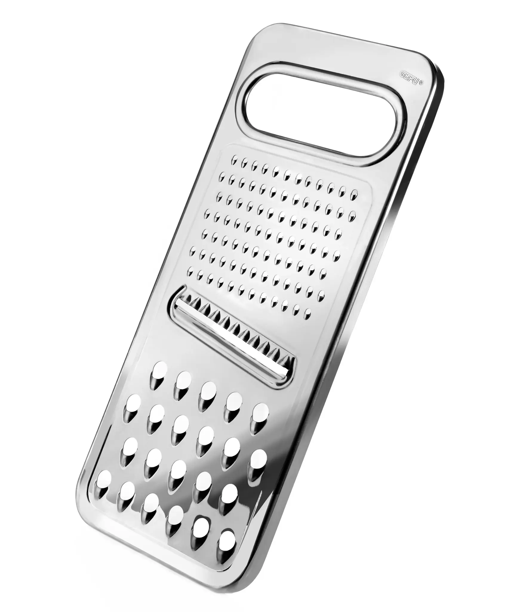 Prezentowana tarka o wymiarach 24,3 x 10,3 x 1 cm (dł. x szer. x wys.) wykonana została ze stali nierdzewnej dzięki czemu jest wytrzymała i odporna na korozję. Trzy powierzchnie trące sprawiają, że jest ona uniwersalnym przyborem, który znajdzie zastosowanie w każdej kuchni. Świetnie sprawdzi się do ścierania owoców i warzyw w drobne i grube wiórki oraz plastry. Doskonale nada się ona do tarcia owoców i warzyw w wiórki. Ergonomiczny uchwyt zapewni przy tym pewny chwyt i bezpieczeństwo, a nieduże wymiary i płaska powierzchnia ułatwią przechowywanie (tarka zmieści się w każdej szufladzie kuchennej). Dodatkową zaletą produktu jest możliwość mycia w zmywarce.