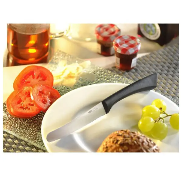 Nóż przeznaczony do wszechstronnego zastosowania w kuchni; nadaje się do krojenia pieczywa, poradzi sobie również z warzywami oraz mięsem. Jego ostrze, wykonane z najwyższej jakości stali nierdzewnej, wyposażone jest w ząbki. Posiada wygodną, dobrze leżącą w dłoni rękojeść, pokrytą warstwą gumy, co zapobiega ślizganiu się noża w dłoni. Nadaje się do mycia w zmywarce.