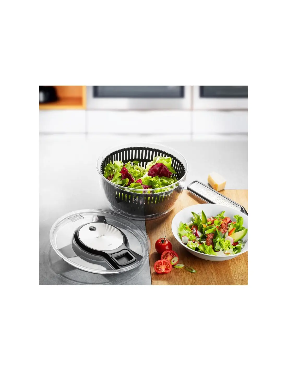 Niezmiernie wygodna w użyciu wirówka SPEEDWING działa dzięki zastosowaniu napędu linkowego. Osiąga ona dużą prędkość dzięki powtarzającemu się pociąganiu kabla, który przytwierdzony jest do wygodnego uchwytu na pokrywie. Wirowanie bez zmiany kierunku osuszy i oczyści z resztek piasku i zabrudzeń delikatne liście sałaty lub innych zielonych warzyw. Na pokrywie znajduje się przycisk STOP oraz wygodna zintegrowana wylewka do pozostałej z wirowania wody. Tarcza napędowa jest odłączana. Miska wirówki o pojemności 5l, wykonana jest z transparentnej stali nierdzewnej, idealnie nadaję się ona do serwowania przygotowanych sałatek. Miska, sito i tarcza napędowa nadają się do mycia w zmywarce. Produkt posiada 5-letnią gwarancję.