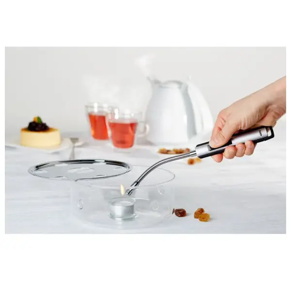 Uniwersalna zapalarka gazowa z piezoelektrycznym iskiernikiem doskonale nadaje się do zapalania płomienia w kuchence gazowej, podpalania w grillu czy w kominku. Wykonana została ze stali nierdzewnej z elementami z tworzywa sztucznego. Posiada długi, elastyczny palnik dzięki któremu można łatwo i bezpiecznie doprowadzić płomień w trudno dostępne miejsce. Wyposażona jest w regulator płomienia, wentyl do uzupełniana gazu oraz uszko do zawieszania zapalarki na haku.