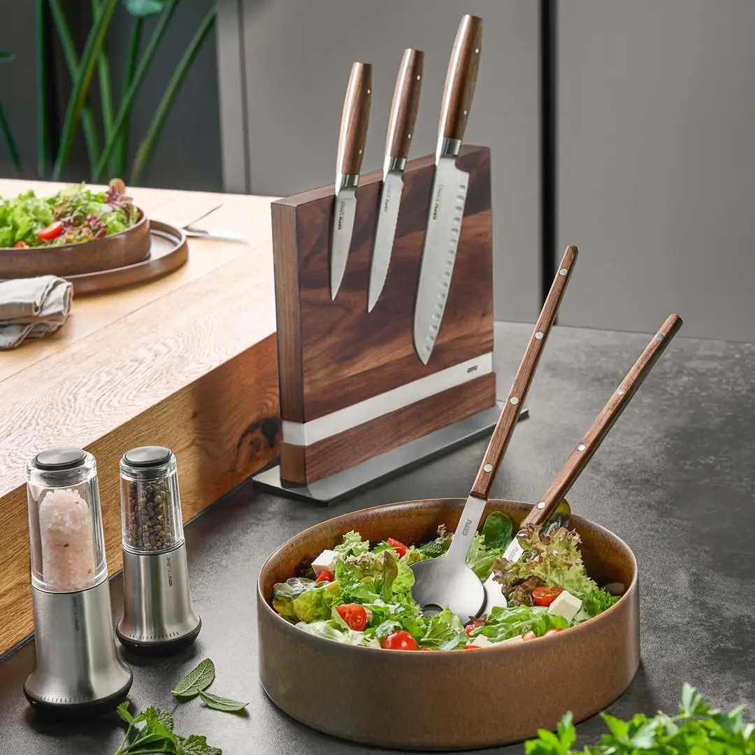 Sztućce do sałaty FILIGO to połączenie klasycznej elegancji i funkcjonalności. Smukła konstrukcja oraz piękne, ergonomiczne uchwyty z drewna orzechowego nadają im wyjątkowy charakter, czyniąc je nie tylko praktycznym narzędziem kuchennym, ale również efektownym elementem nakrycia stołu.