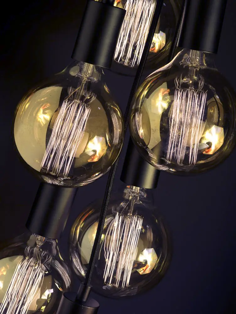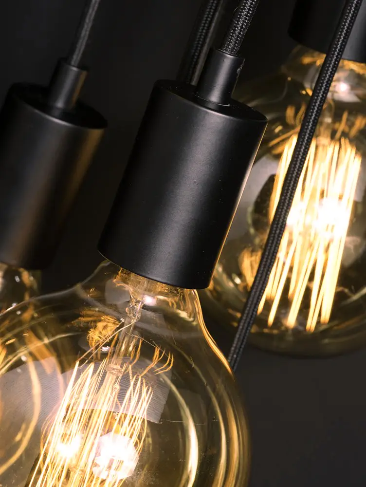 Siedem przewodów z oprawkami na siedem żarówek zrobi wrażenie. Każdy z nich ma nieco inną długość, dzięki czemu całość układa się w stylową gromadę. W zależności od wyboru żarówek można uzyskać zupełnie inny charakter wnętrza.