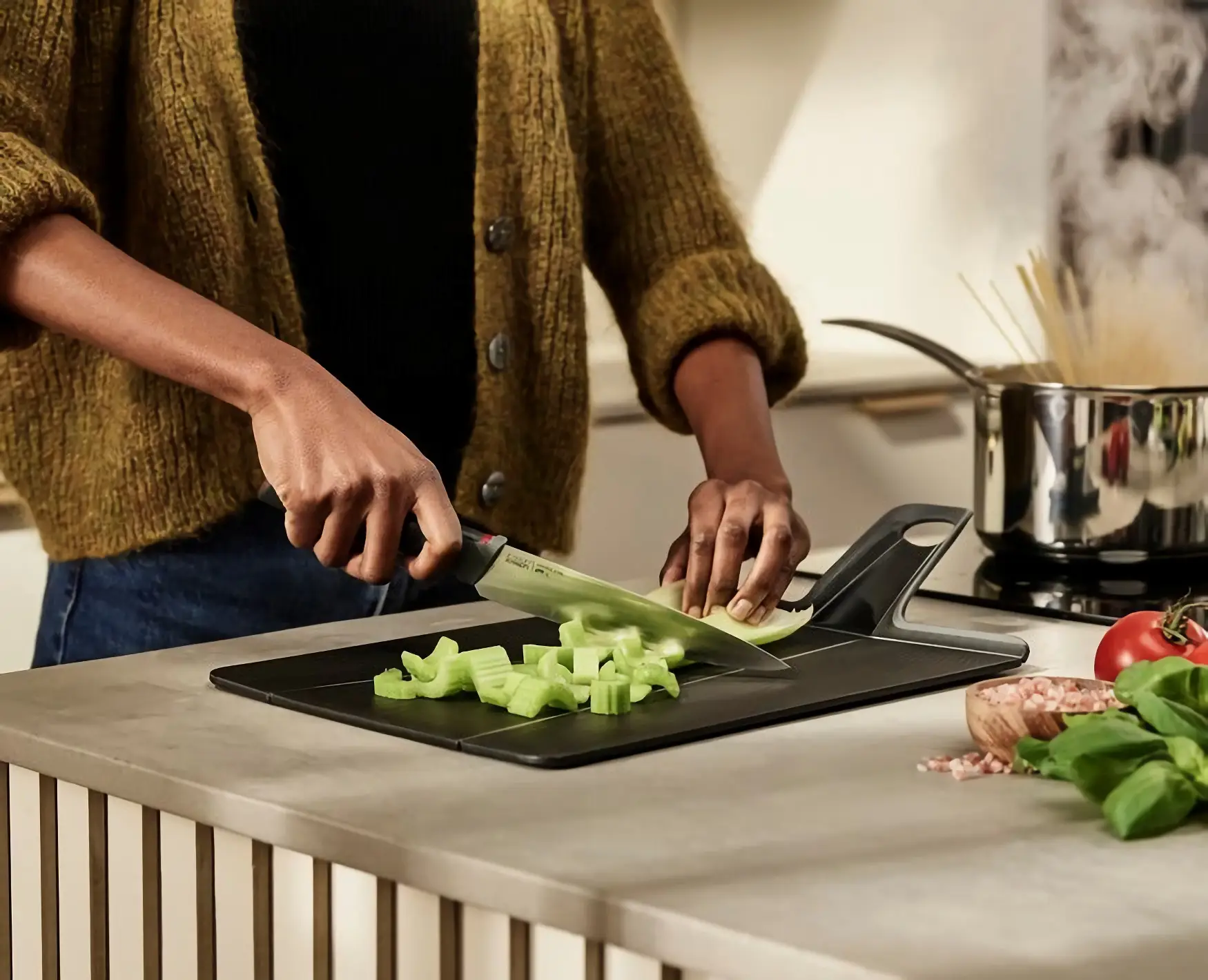 Prezentowana deska Chop2Pot Plus o powierzchni roboczej 21,2 x 26,5 cm i czarnym kolorze doskonale uzupełni wyposażenie kuchenne, pozwalając na wygodne krojenie składników, a następnie na ich łatwe wrzucenie do innego naczynia bez rozsypywania - po podniesieniu deski jej boki unoszą się do góry, tworząc praktyczną rynienkę. Jej miękki uchwyt zapewnia wygodę korzystania, antypoślizgowe nóżki gwarantują odpowiednią stabilność na blacie kuchennym, a praktyczny otwór umożliwia zawieszenie na haczyku kuchennym, ułatwiając przechowywanie. Wykonana została z tworzywa sztucznego. Teksturowana powierzchnia sprawia, że deska jest przyjazna ostrzom noży - ślady po nich na powierzchni deski są normalne i nie są podstawą do reklamacji. Dodatkową zaletą produktu jest łatwość w czyszczeniu - nadaje się on do mycia w zmywarce.
