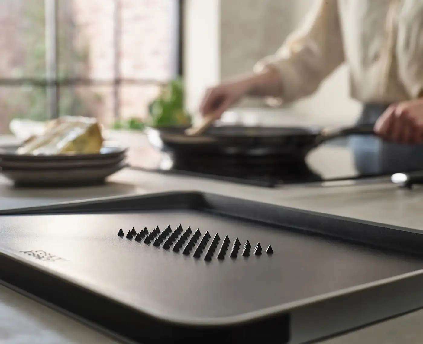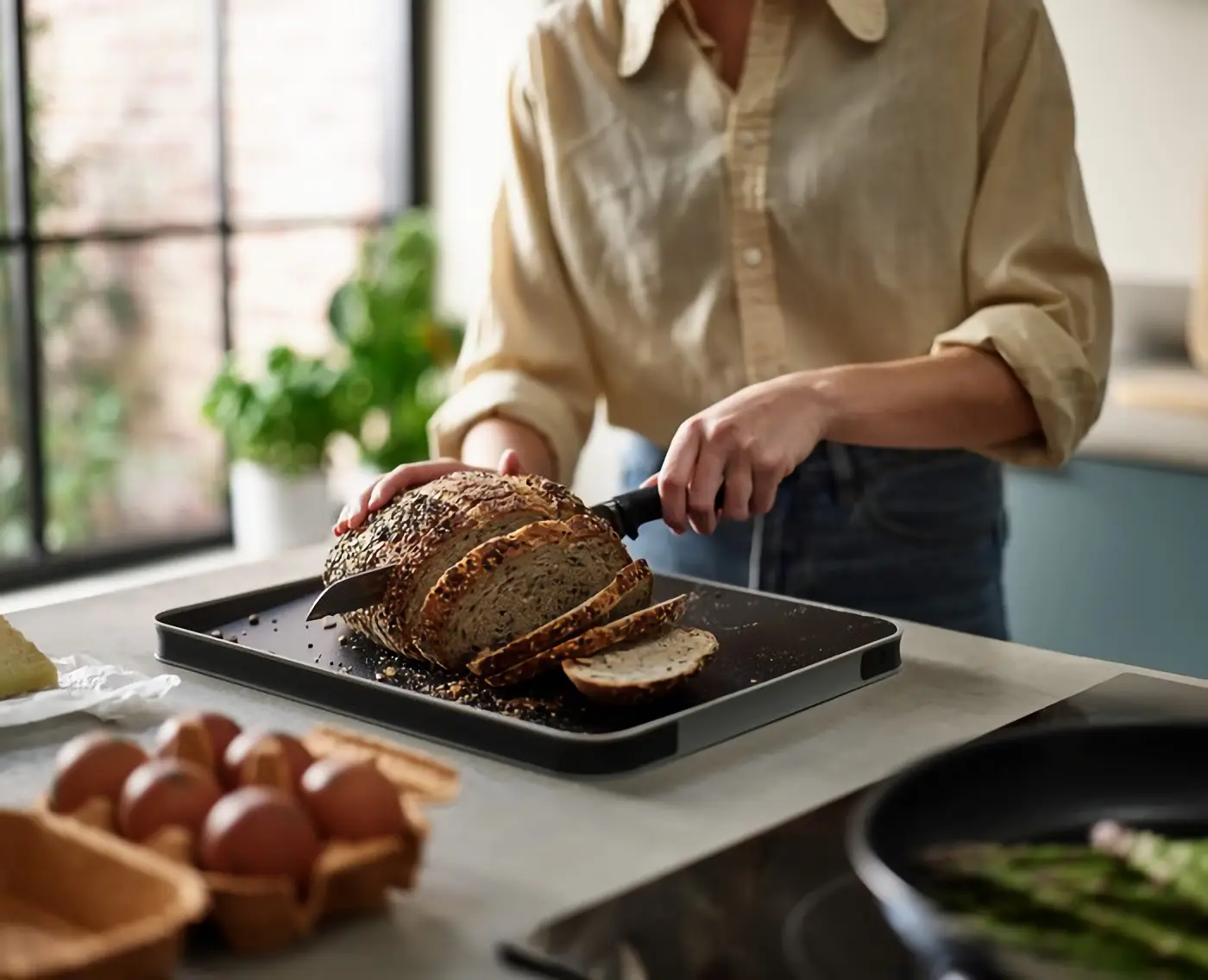 Prezentowana deska kuchenna MultiFunction z linii Duo o wymiarach 29,5 x 37,5 x 2,5 cm (dł. x szer. x wys.) wykonana została z tworzywa sztucznego w czarnym kolorze. Produkt nie tylko umożliwia krojenie składników, ale i sprawdzi się do serwowania przystawek, kanapek itp.. Antypoślizgowe krawędzie zapewniają odpowiednią stabilność, rogi umożliwiają łatwe nalewanie lub wylewanie, a pochylona podstawa oraz podniesione krawędzie chronią przed zabrudzeniami. Deska jest dwustronna - jedna strona ma ząbki dla łatwiejszego przytrzymywania mięs, druga jest gładka. Należy ją myć ręcznie.