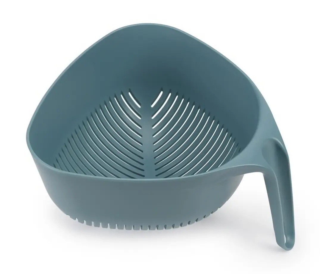 Prezentowany durszlak z linii Duo o wymiarach 16 x 16 x 10 cm (dł. x szer. x wys.) i morskim kolorze wykonano z tworzywa sztucznego. Ma on trójkątny kształt, który ułatwia przesypywanie składników do naczynia. Durszlak wyposażono w otwory odcedzające w kształcie szczelin oraz pionowy uchwyt dla łatwego przechowywania i dodatkowej stabilizacji. Produkt nadaje się do mycia w zmywarce.