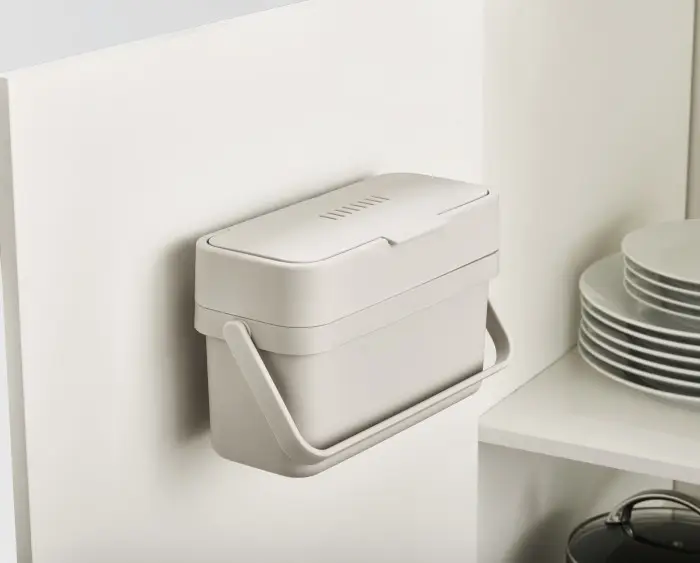 Kompostownik na resztki organiczne o pojemności 4l. Można go przymocować np. na drzwiczkach szfki (zestaw montażowy w opakowaniu). Posiada regulowany otwór wentylacyjny. Łatwy w myciu- myć ręcznie.
