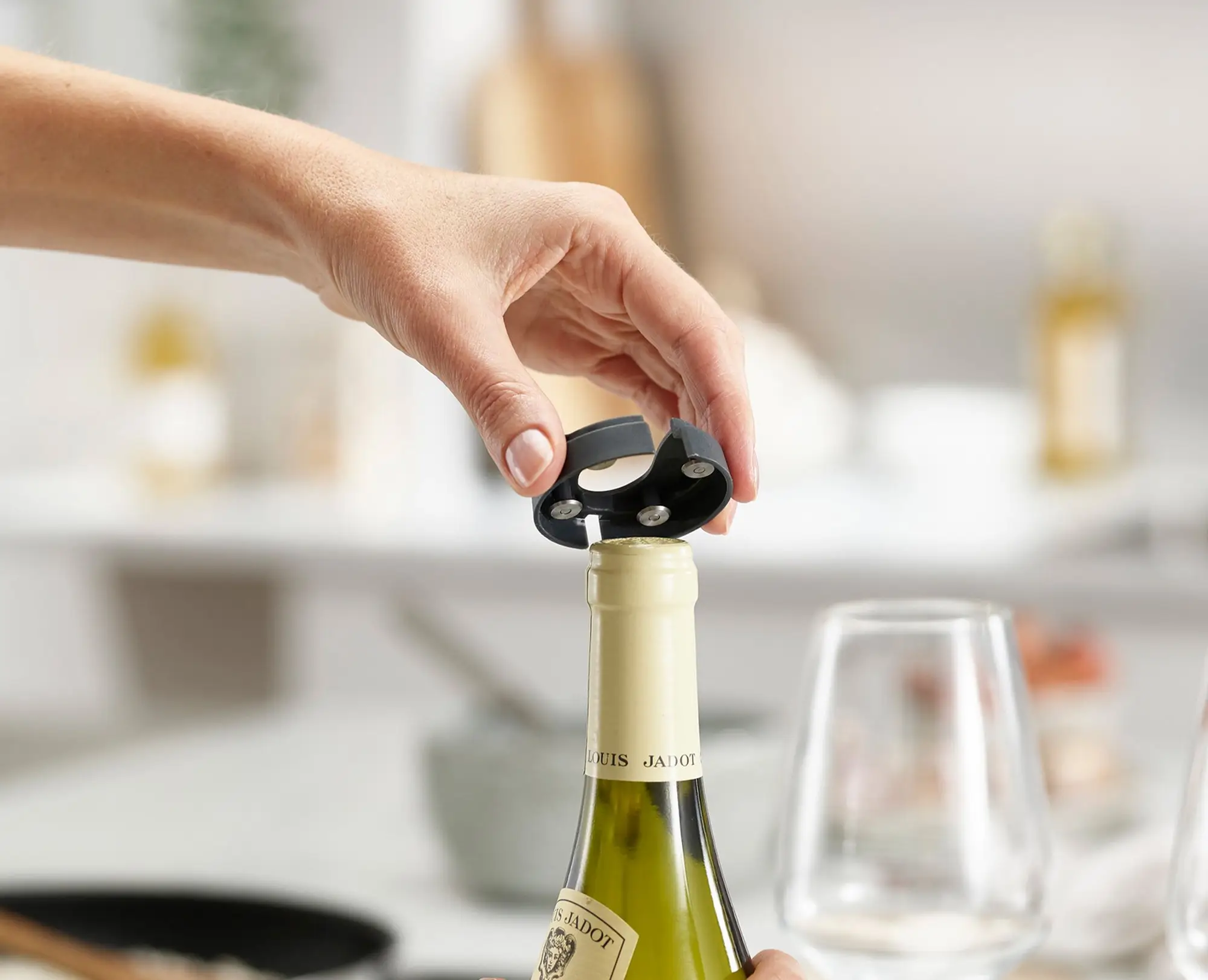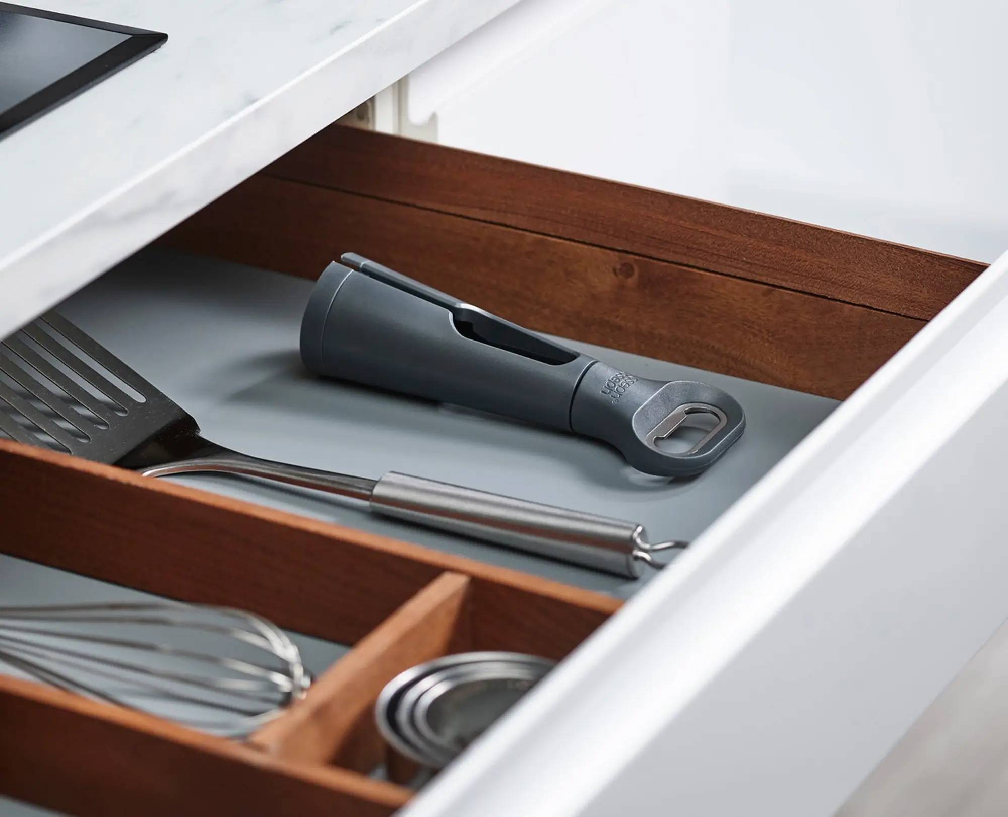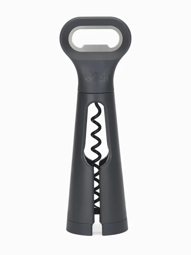 Marka Joseph Joseph tworzy funkcjonalne produkty o nowoczesnym, unikalnym designie z materiałów o wysokiej jakości. Prezentowane narzędzie kuchenne 3 w 1 : korkociąg ze spiralą, nożyk do folii oraz otwieracz do puszek wykonane zostało z tworzywa sztucznego w ciemnoszarym kolorze i stali nierdzewnej. Jest ono nie tylko bardzo praktyczne, ale - dzięki swojemu designowi - oszczędzi miejsce w kuchni i będzie łatwe w przechowywaniu. Produkt ten idealnie sprawdzi się m.in. do otwierania ulubionego wina czy butelek z piwem. Przeznaczony jest on do czyszczenia ręcznego przy użyciu wilgotnej ściereczki. Nożyk do folii jest wyjmowany. Produkt jest bezpieczny w używaniu, jednakże mimo to zalecane jest zachowanie ostrożności ze względu na ostre krawędzie.