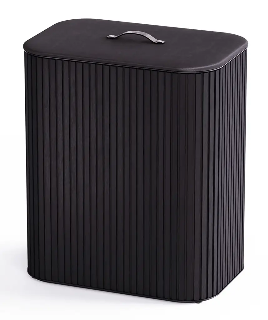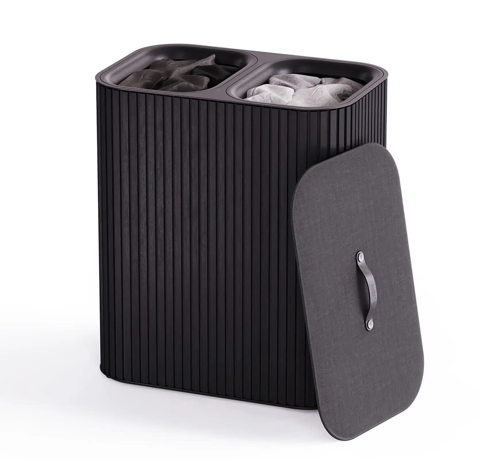 Prezentowany kosz w kolorze czarnym posiada dwie komory o pojemności 45 L każda (pojemność całkowita kosza - 90 L). Jego obudowa wykonana została z bambusa - w celu czyszczenia należy ją przecierać wilgotną ściereczką. Znajdujące się wewnątrz torby można z kolei prać w pralce - przed praniem należy zdjąć z nich obręcze. Komory kosza umożliwią łatwe segregowanie ubrań, co oszczędzi czas podczas robienia prania i pozytywnie wpłynie na zachowanie porządku. W dodatku łatwo będzie je można zamontować z powrotem - samoczynnie wracają na swoje miejsce po wsadzeniu do kosza. Przy korzystaniu z produktu należy zachować ostrożność i nie pozwalać małym dzieciom bawić się nim. Nie należy także stawiać na nim ciężkich przedmiotów.