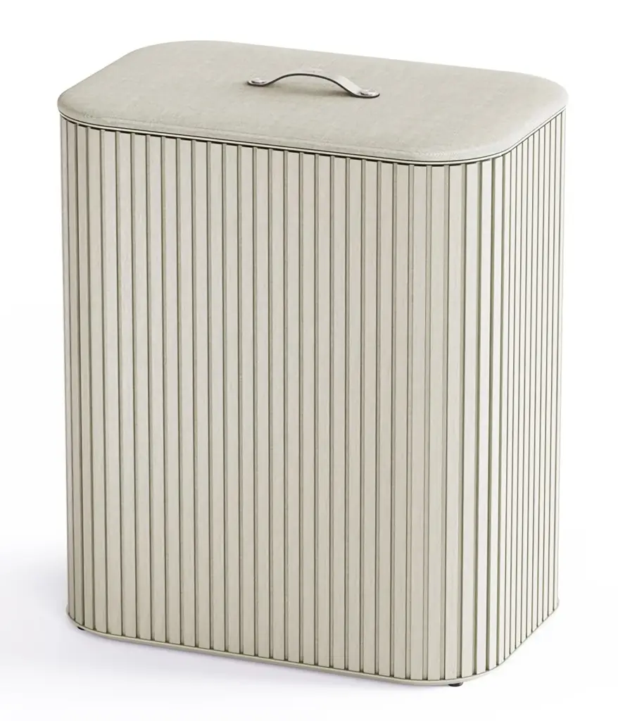 Prezentowany kosz w kolorze beżowym posiada trzy komory o pojemności 30 L każda (pojemność całkowita kosza - 90 L). Jego obudowa wykonana została z bambusa - w celu czyszczenia należy ją przecierać wilgotną ściereczką. Znajdujące się wewnątrz torby można z kolei prać w pralce - przed praniem należy zdjąć z nich obręcze. Komory kosza umożliwią łatwe segregowanie ubrań, co oszczędzi czas podczas robienia prania i pozytywnie wpłynie na zachowanie porządku. W dodatku łatwo będzie je można zamontować z powrotem - samoczynnie wracają na swoje miejsce po wsadzeniu do kosza. Przy korzystaniu z produktu należy zachować ostrożność i nie pozwalać małym dzieciom bawić się nim. Nie należy także stawiać na nim ciężkich przedmiotów.