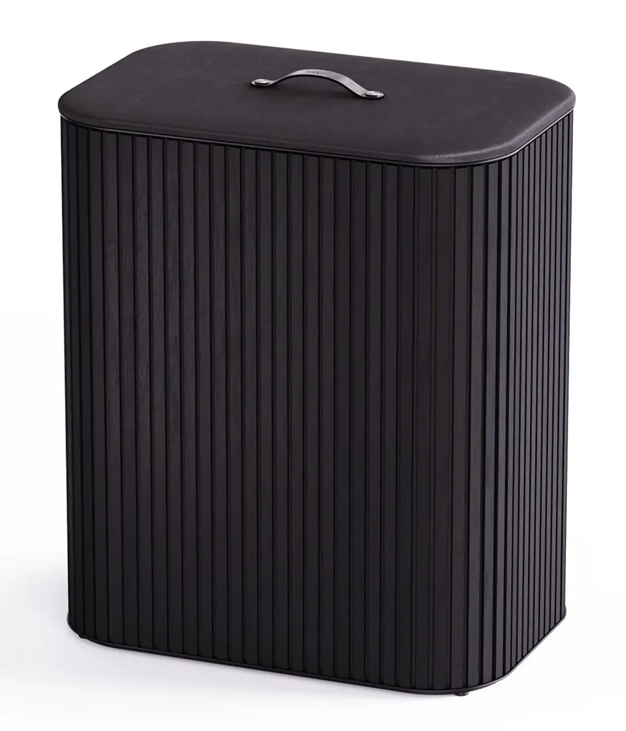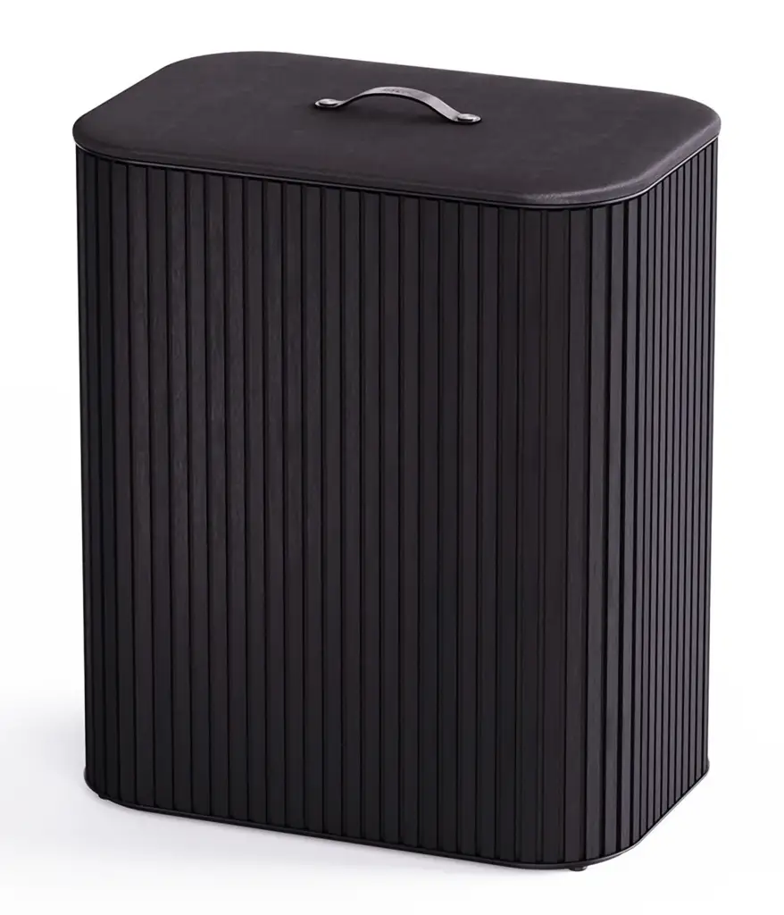 Prezentowany kosz w kolorze czarnym posiada trzy komory o pojemności 30 L każda (pojemność całkowita kosza - 90 L). Jego obudowa wykonana została z bambusa - w celu czyszczenia należy ją przecierać wilgotną ściereczką. Znajdujące się wewnątrz torby można z kolei prać w pralce - przed praniem należy zdjąć z nich obręcze. Komory kosza umożliwią łatwe segregowanie ubrań, co oszczędzi czas podczas robienia prania i pozytywnie wpłynie na zachowanie porządku. W dodatku łatwo będzie je można zamontować z powrotem - samoczynnie wracają na swoje miejsce po wsadzeniu do kosza. Przy korzystaniu z produktu należy zachować ostrożność i nie pozwalać małym dzieciom bawić się nim. Nie należy także stawiać na nim ciężkich przedmiotów.