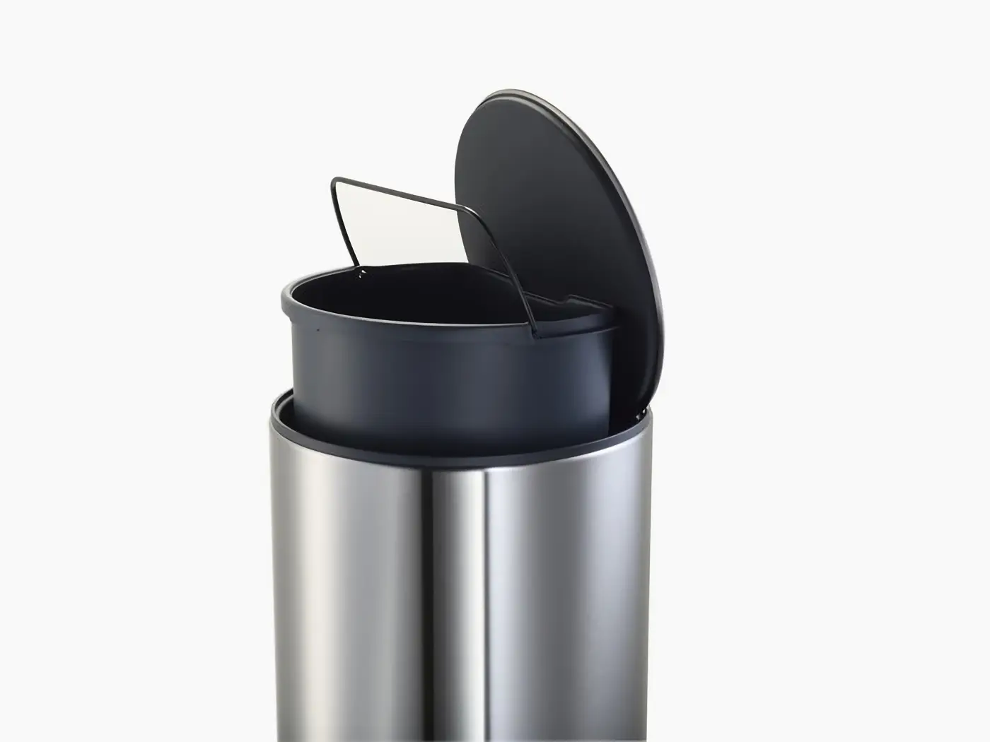 Prezentowany okrągły kosz o pojemności 10 L i wymiarach 26,7 x 26 x 44,7 cm (gł. x szer. x wys.) wykonano ze stali nierdzewnej i tworzywa sztucznego. Produkt otwierany jest przy pomocy systemu pedałowego, który nie wystaje z obudowy, dzięki czemu można z niego wygodnie korzystać nawet gdy obie ręce są zajęte. Wyposażono go również w wolnoopadającą pokrywę z filtrem węglowym (działa 3 miesiące), na której nie odbijają się palce, co zapewni odpowiednią dyskretność. W środku kosz posiada wyjmowane wiadro, dzięki czemu można go łatwo opróżnić gdy się zapełni. Umieszczona z tyłu komora na worki na śmieci pozwala na trzymanie ich tak by były łatwo dostępne. Produkt należy czyścić ręcznie.