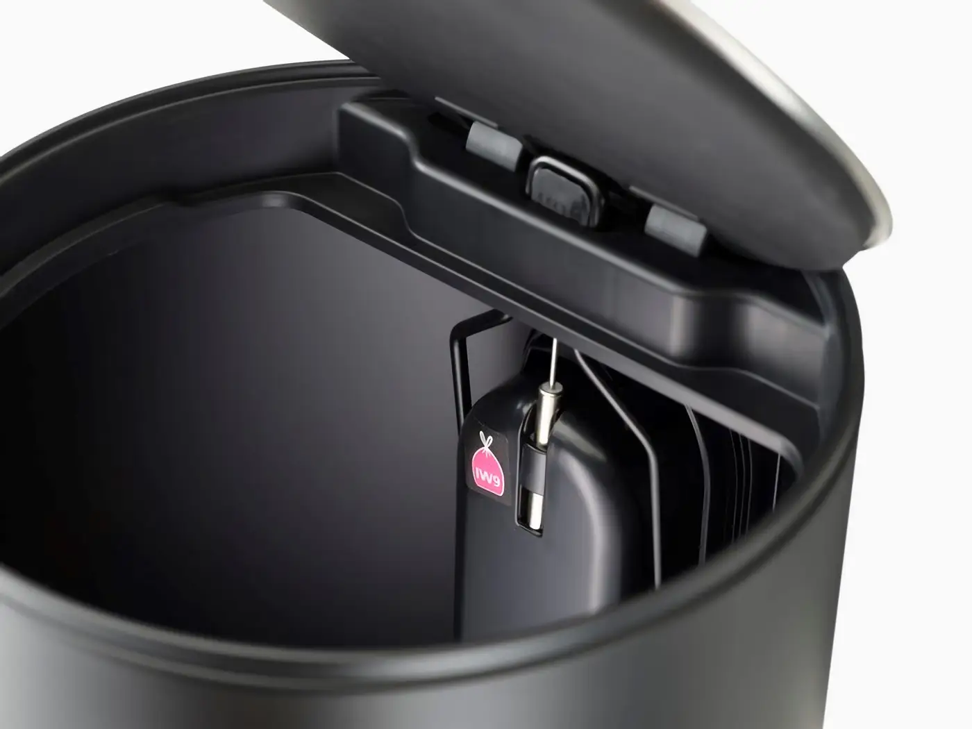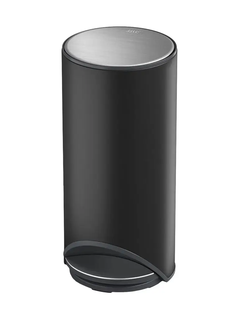 Prezentowany okrągły kosz o pojemności 30 L i wymiarach 34 x 33,5 x 71,5 cm (gł. x szer. x wys.) wykonano ze stali węglowej malowanej na czarno (matowe wykończenie) i tworzywa sztucznego. Produkt otwierany jest przy pomocy systemu pedałowego, który nie wystaje z obudowy, dzięki czemu można z niego komfortowo korzystać nawet gdy obie ręce są zajęte. Wyposażono go także w wolnoopadającą pokrywę z filtrem węglowym (działa 3 miesiące), na której nie odbijają się palce, co zapewni odpowiednią dyskretność. W środku kosz posiada wyjmowane wiadro, dzięki czemu można go łatwo opróżnić gdy się zapełni. Umieszczona z tyłu komora na worki na śmieci pozwala na trzymanie ich tak by były łatwo dostępne. Produkt należy czyścić ręcznie.