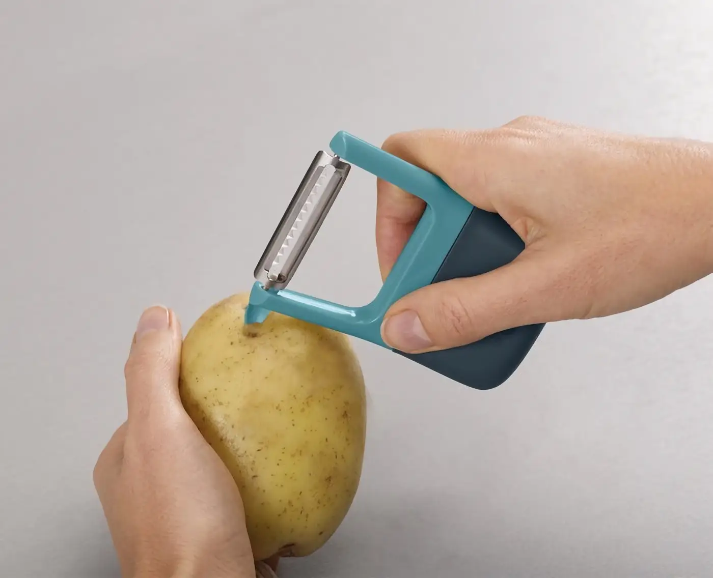 Prezentowana obieraczka julienne w kształcie litery "U" z linii Duo ma wymiary 9 x 8 x 2,5 cm (dł. x szer. x wys.) i szaro-morski kolor. Wyposażono ją w ostrze ze stali nierdzewnej i krótki, ergonomiczny uchwyt z tworzywa sztucznego. Posiada ona również narzędzie do wykrawania oczek z ziemniaków. Obieraczka ułatwi przygotowywanie różnych posiłków, umożliwiając wygodne obieranie różnych warzyw. Dodatkowo produkt jest łatwy w przechowywaniu - niewielkie wymiary sprawiają, że nie zajmuje on wiele miejsca w szufladzie. Obieraczkę należy czyścić ręcznie.