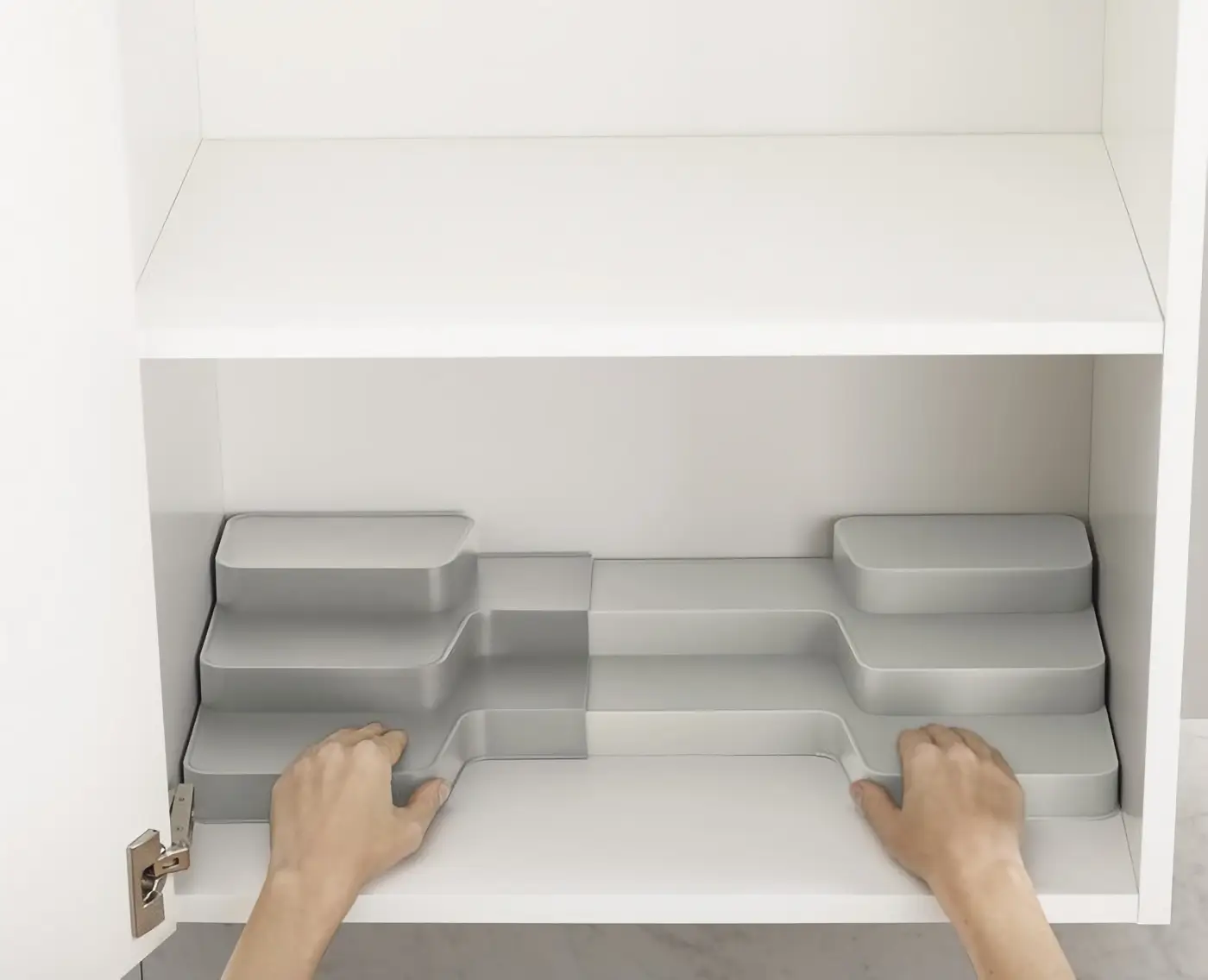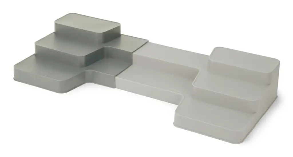 Prezentowany organizer do szafki z linii Duo ma wymiary 26 x 42/62 x 9 cm (gł. x szer. x wys.) i wykonany został z tworzywa sztucznego w szarym kolorze. Ułatwi on zagospodarowanie wnętrza szafki, pozwalając na wygodne przechowywanie np. słoików - kształt schodów zapewnia łatwy dostęp i widoczność, jednocześnie oszczędzając miejsce. Regulowana szerokość organizera sprawia, że można go dostosować do własnych potrzeb - produkt pasuje do szafek o głębokości min. 26 cm i szerokości min. 42 cm. Należy go czyścić ręcznie przecierając wilgotną ściereczką.