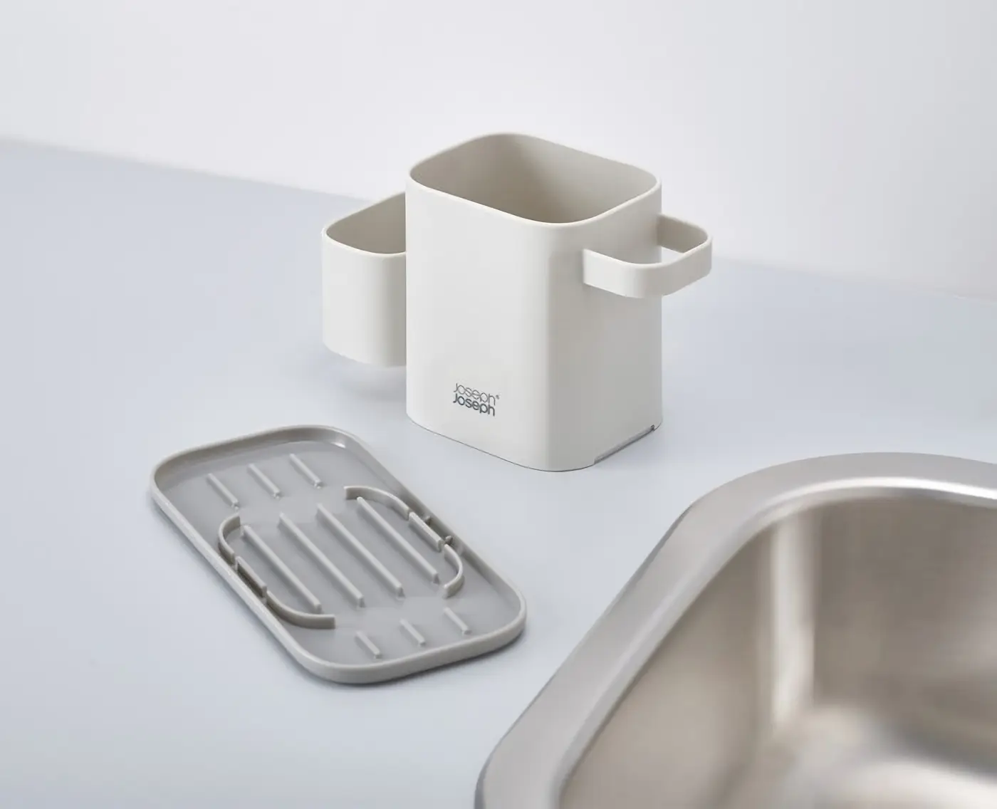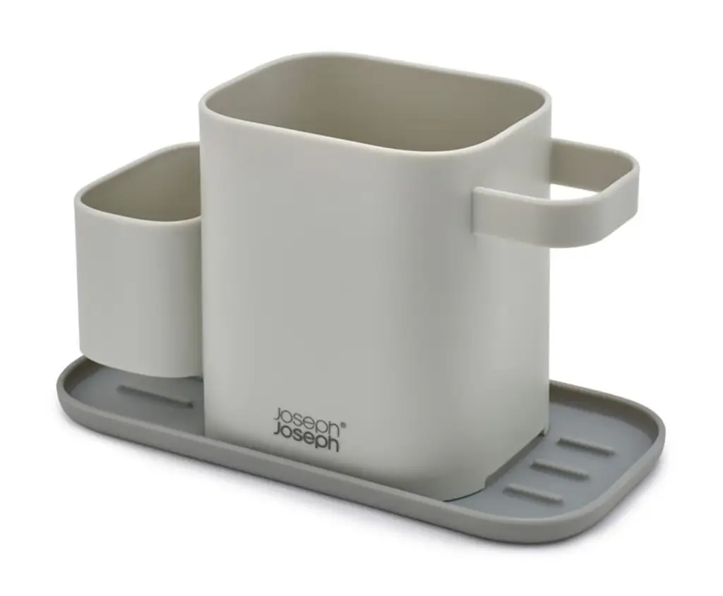 Prezentowany organizer do zlewu z linii Duo o wymiarach 10,1 x 21,3 x 12,5 cm wykonany został z tworzywa sztucznego w szarym kolorze. Uzupełni on wyposażenie kuchenne ułatwiając zachowanie porządku, a jednocześnie zapewniając łatwy dostęp do akcesoriów do mycia naczyń. Organizer zmieści standardową butelkę płynu do naczyń, gąbkę i szczotkę (dodatkowe boczne uchwyty). Wyposażono go w praktyczną podstawkę zbierającą wodę. Produkt przeznaczony jest do czyszczenia ręcznego.