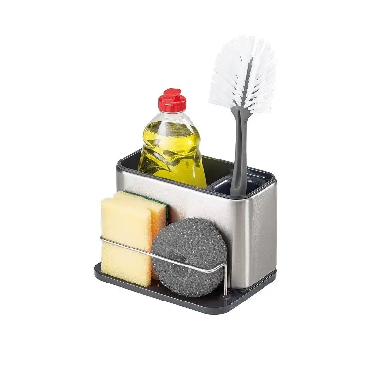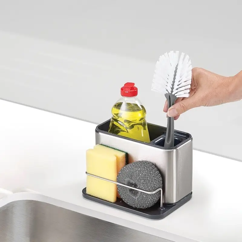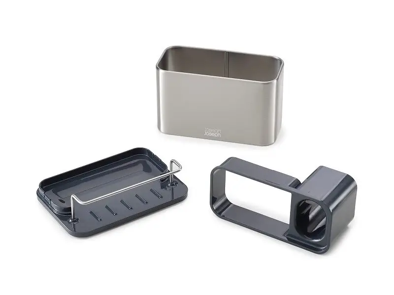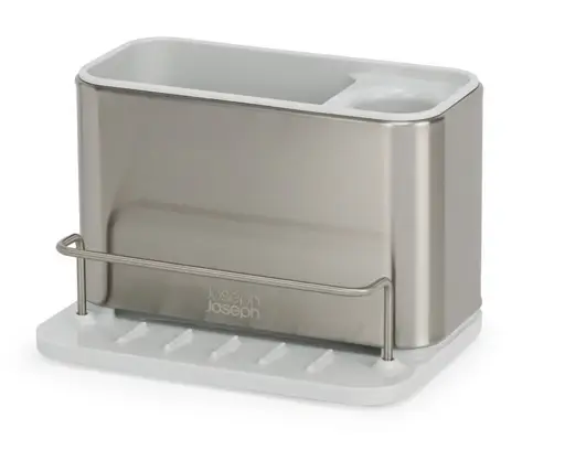 Prezentowany srebrno-czarny organizer do zlewu ma wymiary 18 x 12,5 x 12,8 cm (dł. x szer. x wys.). Doskonale odnajdzie się w nowocześnie urządzonej kuchni, dzięki kilku komorom i stojakowi pozwalając na wygodne przechowywanie butelki z płynem, gąbek, szczotek czy ściereczek, ułatwiając ich osuszanie. Można go będzie postawić na krawędzi zlewu, tak by przybory znajdowały się pod ręką - antypoślizgowe nóżki zapewnią przy tym niezbędną stabilność. Pochyła podstawa sprzyjać będzie przy tym usuwaniu wody. Dodatkową zaletą organizera jest łatwość w czyszczeniu - choć należy go myć ręcznie, można go rozłożyć by bez problemu dotrzeć do każdego miejsca.