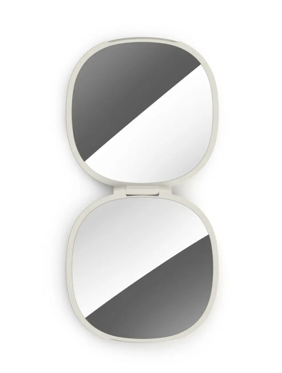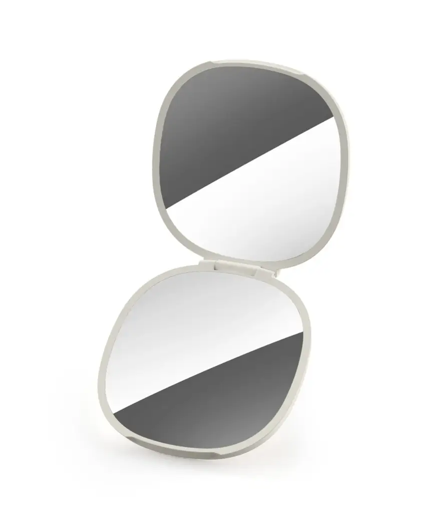 Prezentowane składane kompaktowe lusterko z zamknięciem magnetycznym pozwala na wygodne sprawdzenie i poprawienie makijażu poza domem, nie zajmując przy tym wiele miejsca. Produkt posiada standardowe lustro do przejrzenia twarzy oraz lusterko powiększające trzykrotnie, które umożliwia dopracowanie szczegółów np. podczas nakładania tuszu do rzęs. Miękki silikonowy pasek na obudowie pozwala na komfortowe, pewne przytrzymanie lusterka podczas korzystania. Nadaje się również do bezpiecznego przeniesienia drobnych akcesoriów np. kredki, szminki czy tuszu, by te nie gubiły się w plecaku bądź torbie. Produkt nie sprawi problemów w utrzymaniu w czystości, należy go jednak czyścić ręcznie obudowę przecierając wilgotną ściereczką a lusterka mikrofibrą, by ich nie porysować.