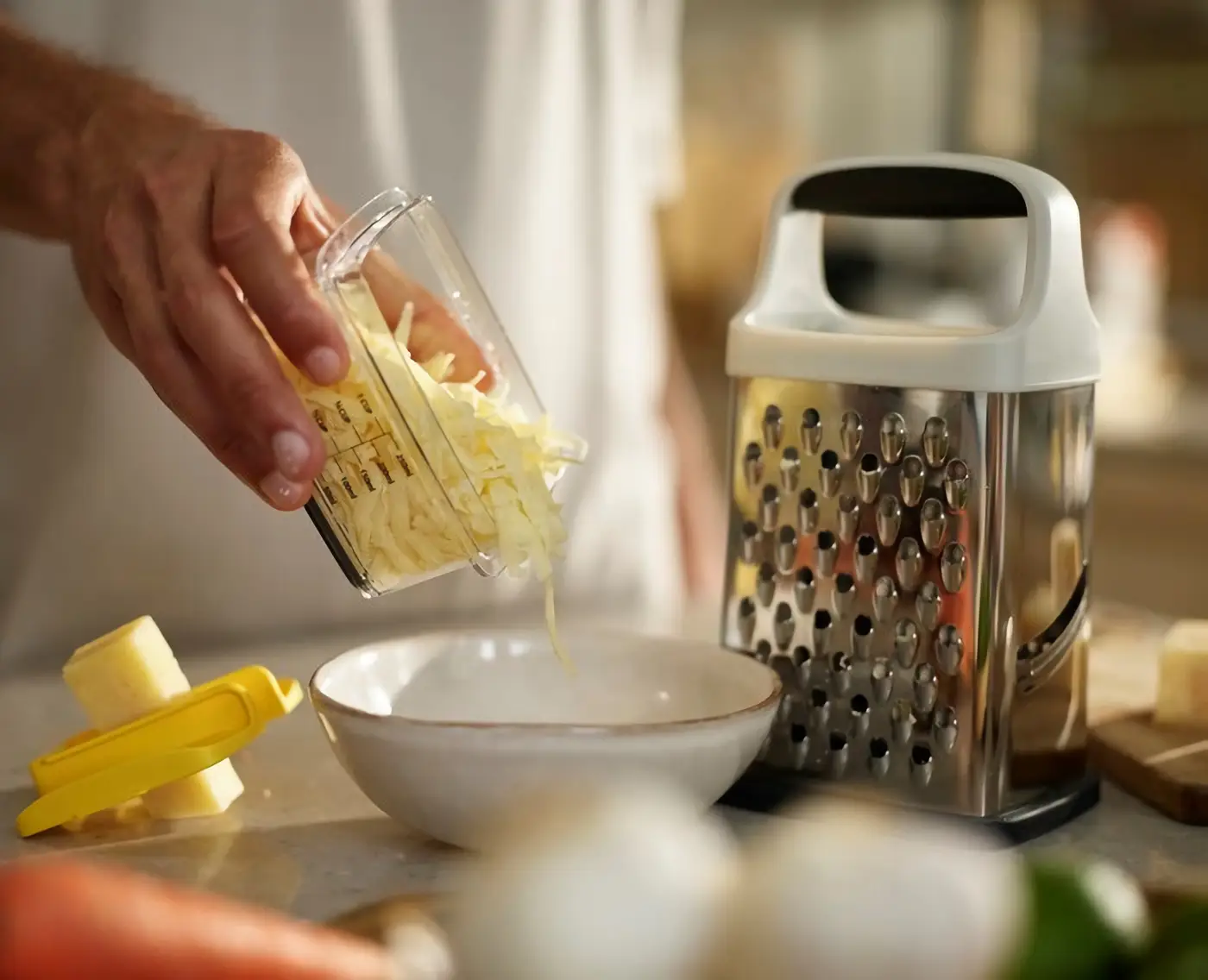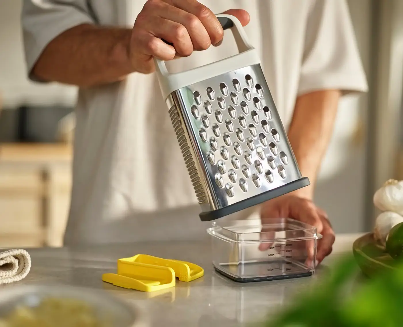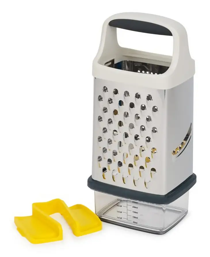 Prezentowana tarka pudełkowa Multi-Grip o wymiarach 26 x 12,2 x 9,9 cm (wys. x szer. x gł.) posiada 4 rodzaje ostrzy wykonanych ze stali nierdzewnej, ergonomiczny uchwyt oraz antypoślizgową podstawę, dzięki czemu nie tylko dobrze spełnia swoją funkcję, ale i jest odpowiednio stabilna. W komplecie dołączony został chwytak do warzyw mieszczący się w jej górnej części (łatwe przechowywanie), zapewniający większe bezpieczeństwo podczas tarcia - chroni dłonie przed skaleczeniami (należy zachować odpowiednią ostrożność). Produkt posiada również pojemnik o pojemności 0,25 L do zamocowania oraz przechowywania w podstawie, który zbiera tarte produkty ograniczając bałagan. Dodatkowo na jego ściance znajduje się praktyczna skala do wygodnego odmierzania ilości tartych składników. Tarkę oraz chwytak można myć w zmywarce, pojemnik tylko ręcznie.