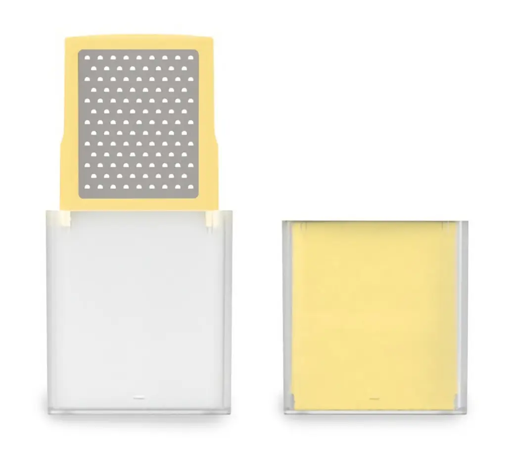 Prezentowana tarka z pojemnikiem z linii Duo ma wymiary 10 x 11 x 12 cm (gł. x szer. x wys.) i żółto-srebrny kolor. Produkt wykonany został ze stali nierdzewnej i tworzywa sztucznego. Tarka posiada 2 typy stalowych ostrzy: drobne i grube, dzięki czemu sprawdzi się do tarcia różnych składników. Dołączony w komplecie pojemnik nadaje się do przechowywania tartych składników oraz samej tarki. Dodatkowo dzięki skali na ściankach (w ml i szklankach) ułatwi odmierzanie ich ilości. Antypoślizgowa baza zapewnia odpowiednią stabilność podczas używania. Produkt przeznaczony jest do mycia ręcznego.