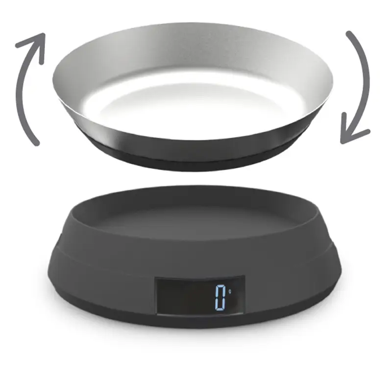 Waga cyfrowa SwitchScale od angielskiej marki Joseph Joseph składa się z dwóch praktycznych części. Podstawki wyposażonej w wyraźny, duży wyświetlacz LCD oraz miski która funkcjonuje jako pokrywka dla wagi oraz powierzchni w której można warzyć produkty w torebkach czy innych opakowaniach. Po odwróceniu miski bez problemu można wsypać do niej pridukty sypie w celu dokładnego zważenia.