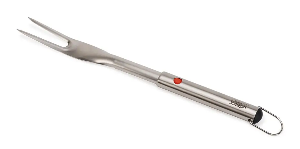 Prezentowany widelec o wymiarach 41,73 / 35 x 3,57 x 2,2 cm (dł. x szer. x gł.) wykonano ze stali nierdzewnej. Doskonale sprawdzi się on do umieszczania na ruszcie i przewracania kiełbasek, szaszłyków, mięs itp.., ułatwiając również ich nakładanie. Dla wygody używania widelec posiada wysuwaną głowicę i część uchwytu. Dodatkowo wyposażono go w praktyczną pętelkę do zawieszenia na haczyku obok grilla lub w kuchni. Produkt nadaje się do mycia w zmywarce.