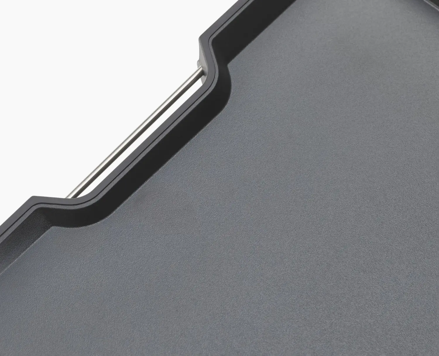 Prezentowana wielofunkcyjna deska w kolorze czarnym i rozmiarze L ma wymiary 29 x 41 x 2,5 cm. Przeznaczona jest do krojenia wszelkiego rodzaju żywności. Na jednej z jej stron znajdują się wypustki do łatwiejszego przytrzymywania mięsa, by nie ślizgało się ono podczas dzielenia na mniejsze porcje. Druga strona jest całkowicie gładka i świetnie sprawdzi się do krojenia pieczywa lub warzyw. Pochylona podstawa w połączeniu z podniesionymi krawędziami ułatwia zbieranie i usuwanie okruchów i soków z powierzchni deski, jednocześnie chroniąc blat przed zabrudzeniami. Z kolei antypoślizgowe krawędzie unieruchamiają produkt na powierzchni roboczej, zapewniając wygodę i stabilność podczas pracy z nią. Dodatkowo deska posiada uchwyty ze stali nierdzewnej, które ułatwią jej przenoszenie - dzięki temu posłużyć może także do serwowania np. przekąsek. Zaletą deski jest także możliwość mycia jej w zmywarce.
