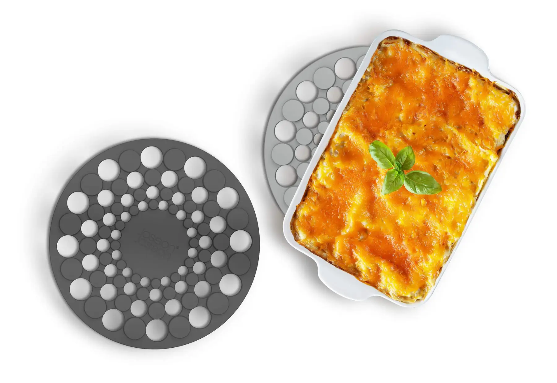 Angielska marka Jospeph Joseph tworzy praktyczne produkty o nowoczesnym designie. Prezentowany zestaw 2 silikonowych podstawek pod gorące naczynia Spot-On nie tylko uchroni powierzchnię blatu czy stołu przed działaniem wysokiej temperatury oraz zarysowaniami, ale i - ze względu na swój unikalny wygląd - bardzo elegancko się zaprezentuje podczas serwowania różnego rodzaju potraw czy to w garnku, patelni czy w naczyniach do zapiekania. Podkładki wykonane zostały z silikonu i są odporne na powstawanie plam oraz temperaturę do 220°C - należy jednak zachować ostrożność przy używaniu ich na powierzchniach takich jak naturalne, polerowane lub lakierowane drewno, korek i obrusy plastikowe, jako że mogą one nie zapewniać całkowitej izolacji cieplnej. Dzięki możliwości mycia w zmywarce są one bardzo łatwe w czyszczeniu. Ponadto będą łatwe i wygodne w przechowywaniu, przy czym oszczędzą miejsce w szafce - wystarczy połączyć je razem.