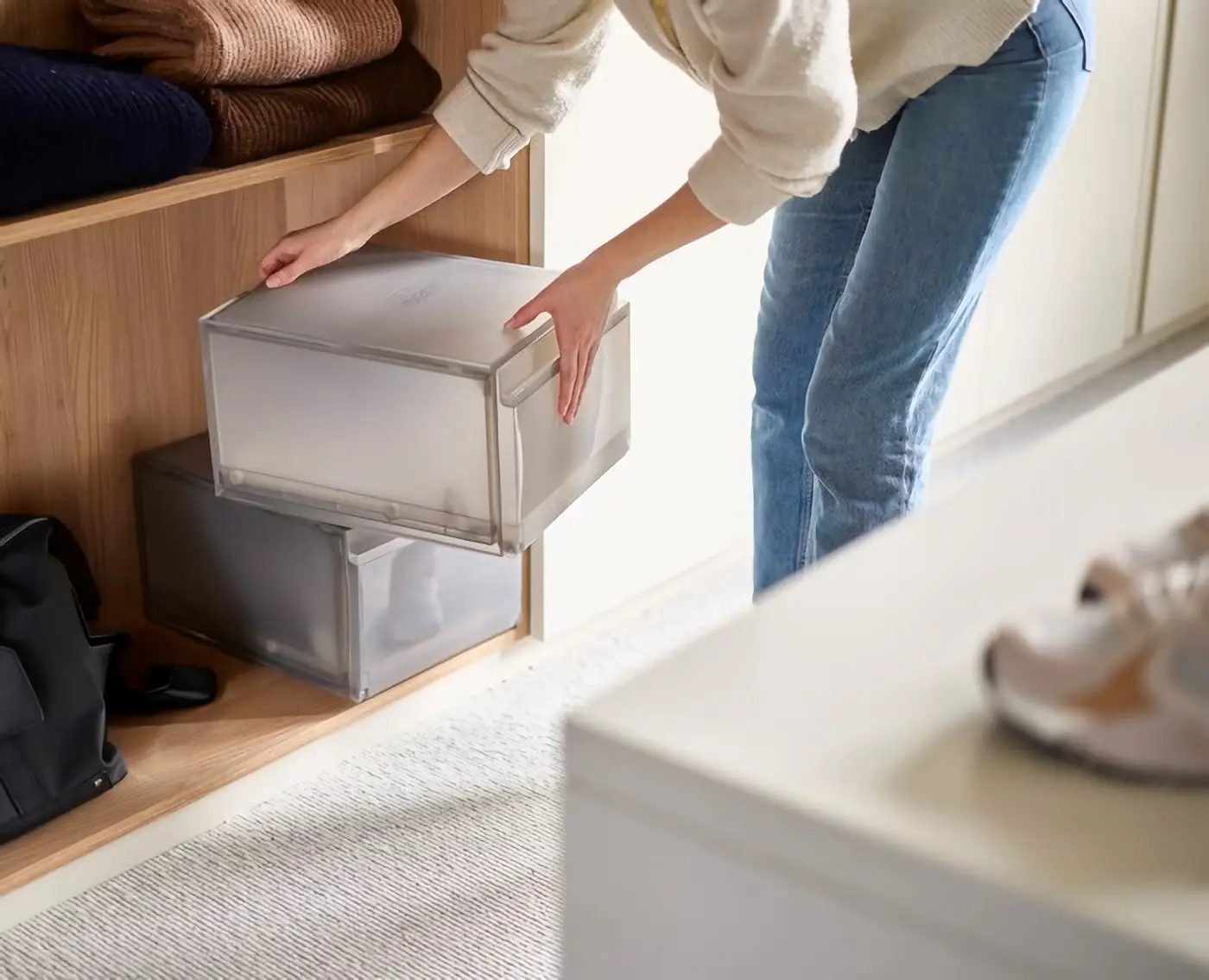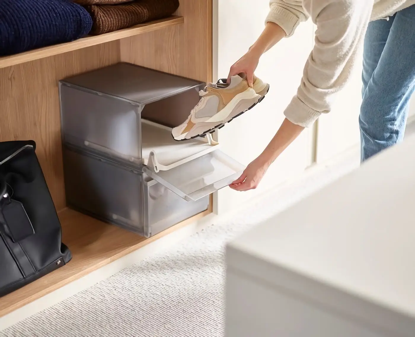 Prezentowany zestaw ShoeCase składa się z 2 pojemników do przechowywania butów. Wykonano je z tworzywa sztucznego w 40% z recyklingu w stonowanej kolorystyce (kolor taupe). Każdy z nich ma wymiary 37,5 x 27,9 x 21,7 cm (gł. x szer. x wys.) i pozwala na wygodne trzymanie jednej pary butów. Pojemniki posiadają wysuwaną tackę w każdej części i są wentylowane. Dzięki możliwości ustawiania jeden na drugim, można je wygodnie umieścić także w mniejszych przestrzeniach. W razie zabrudzenia zestaw należy czyścić wilgotną ściereczką.