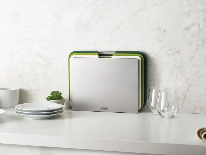 Zestaw rewelacyjnie wygląda na kuchennym blacie, jest bardzo praktyczny, można myć w zmywarce. Stojak zaprojektowany tak, by deski stały w nim stabilnie. Z obu stron mają wgłębienia zapobiegające rozlewaniu się płynów z obrabianych produktów i antypoślizgowe silikonowe wstawki. Idealne do nowoczesnych kuchni