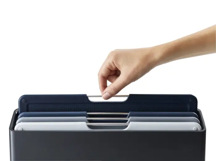Deski na stojaku umiejscowione są w takim sposób, że nie stykają się ze sobą, dzieki czemu powietrze może krążyć swobodnie pomiędzy nimi. Zarówno deski, jak i stojak zostały wyposażone w antypoślizgowe elementy, dzięki czemu są bezpieczne i wygodne w użytkowaniu. Zestaw desek Folio to stylowe wyposażenie, które świetnie prezentuje się na kuchennym blacie. To także doskonały pomysł na praktyczny prezent. Deski można myć w zmywarce, natomiast stojak najlepiej czyścić przy pomocy wilgotnej ściereczki.