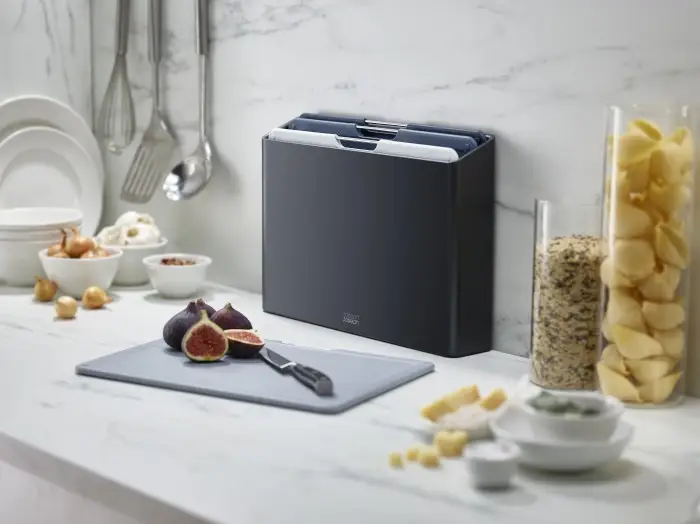 Funkcjonalny i poręczny niezbędnik kuchenny zawierający 4 deski do krojenia marki Joseph Joseph. Deski zostały wykonane z tworzywa sztucznego o fakturowanej powierzchni, która ułatwia krojenie i nie zniszczy ostrzy noży.